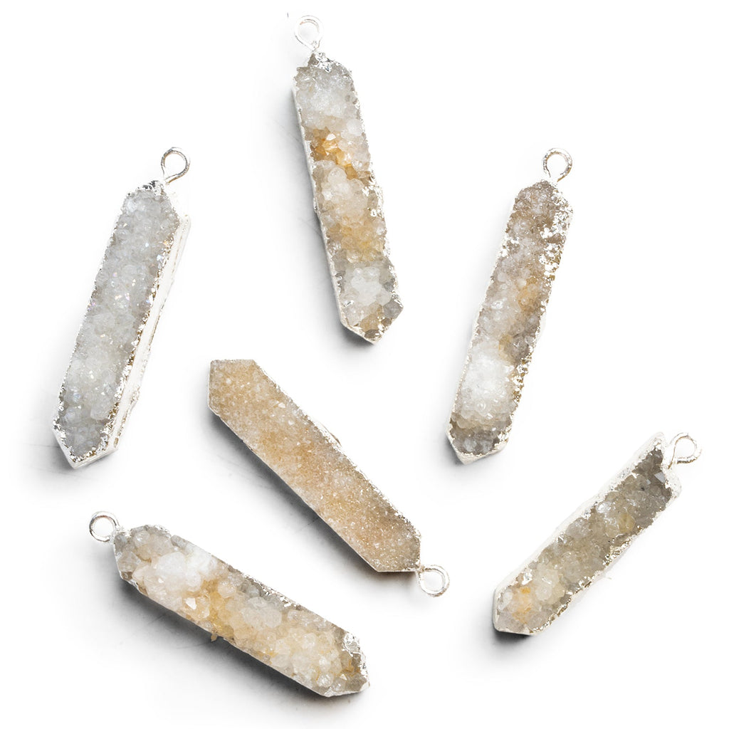 Beads measure about 36x7mm with a few mm of variation possible. These elongated, pointed-bar shapes feature the glittering sparkle coveted by fans of Drusy in spades. These white to rust toned natural drusy pieces look amazing enveloped in our signature silver leaf. Imbue your designs with the elegant allure of Drusy with these gorgeous focal beads, ideal for bringing together necklaces, bold earrings and much more.