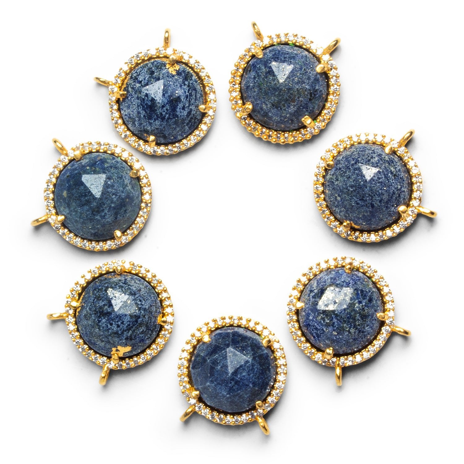 Rich, inky blues with natural golden flecks give these lapis lazuli coins their unmistakable, night-sky depth. Each stone is smoothly faceted and bezel-set in warm gold vermeil, then framed with a sparkling CZ pavé halo that adds just the right amount of refined shimmer. The contrast between the velvety blue lapis and the crisp brilliance of the halo creates a luxe, statement-ready look that still feels organic and gemstone-forward.