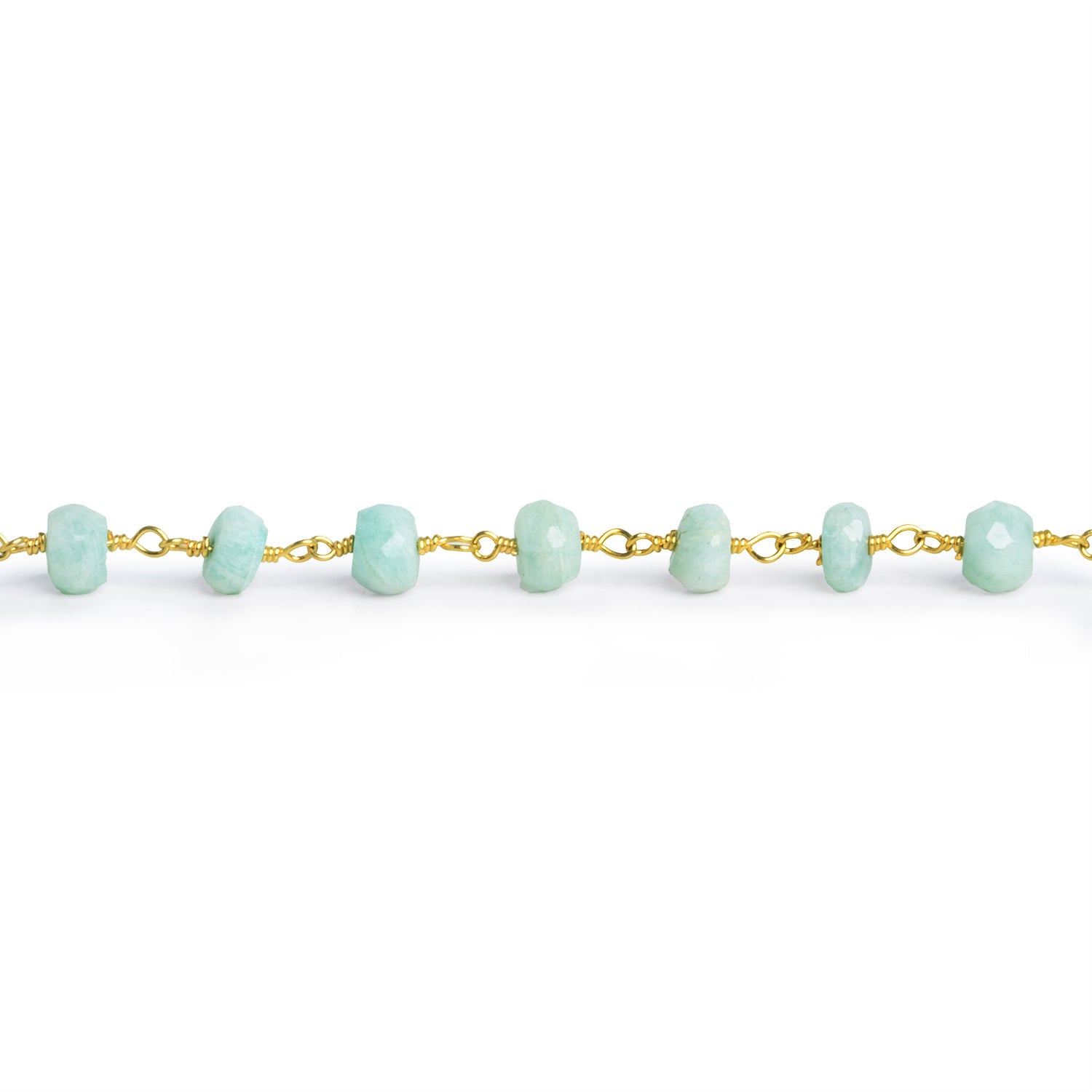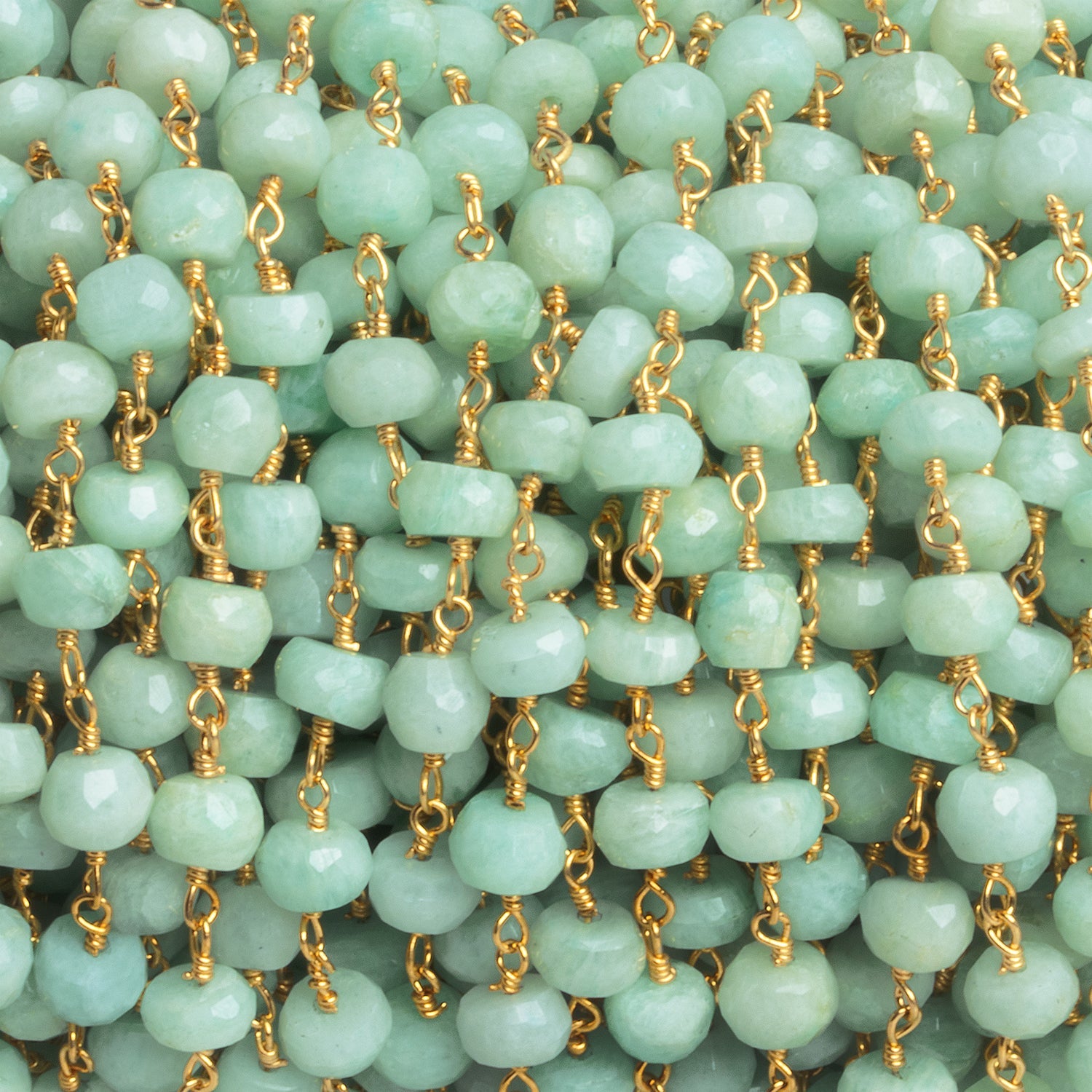 Beads measure about 6mm in diameter with about 29 beads per foot of chain. Our high-quality Blue-Green Amazonite comes on thick faceted rondelles that look amazing paired with our signature handwrapped gold plated chain. Fans seeking eye-catching chain and hand-crafted quality should jump on this masterfully faceted chain design, perfect for elegant necklaces, earrings and more!
