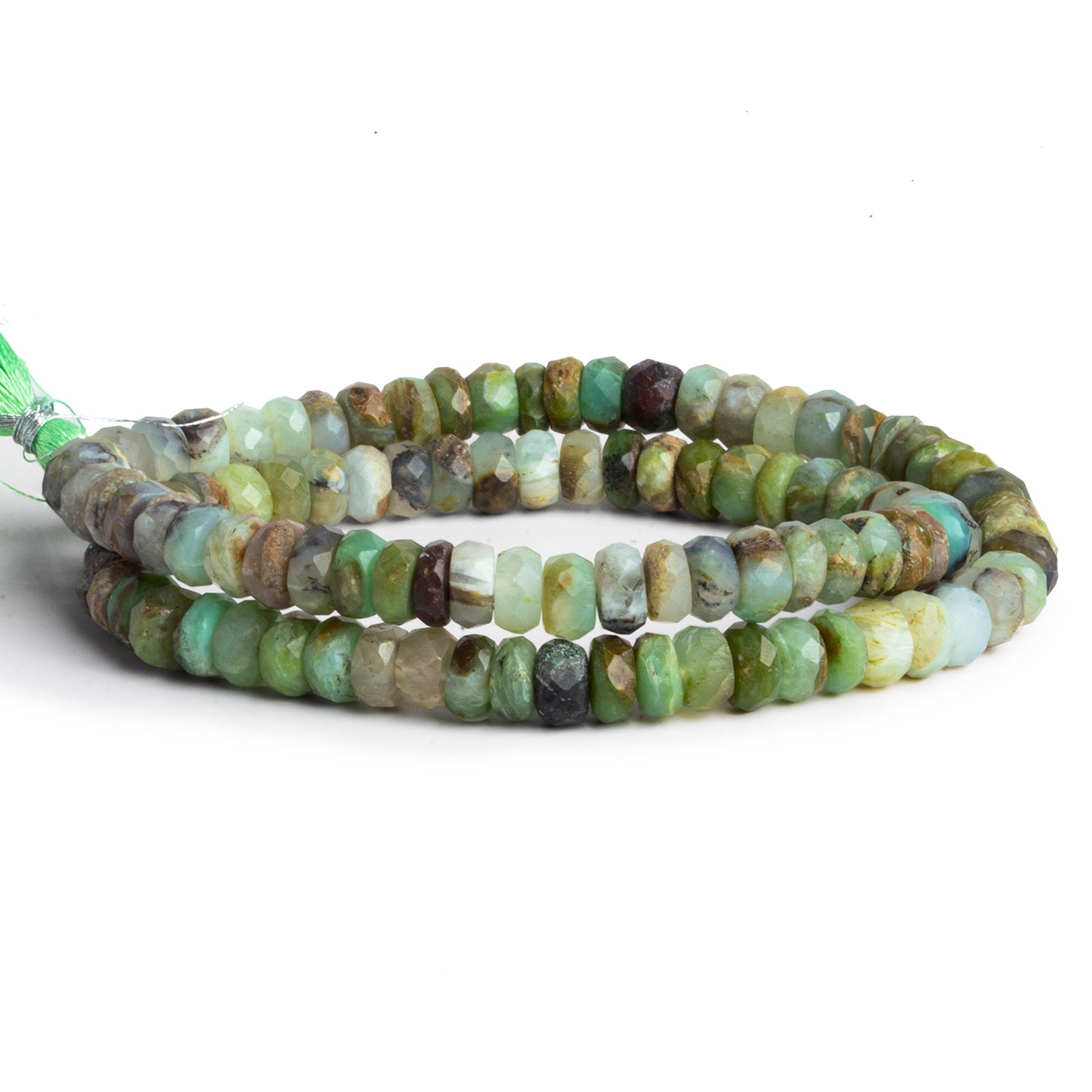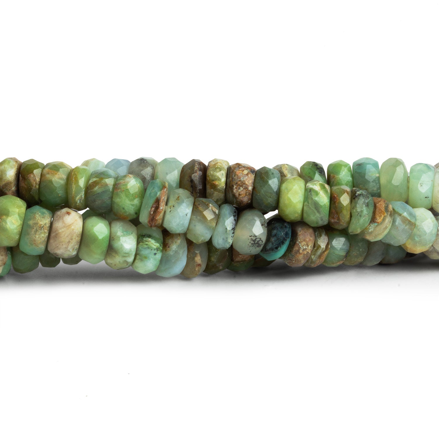 These Blue Peruvian Opal faceted rondelles showcase a rich, organic palette of soft aqua, seafoam, mint, and earthy sage tones, punctuated by natural matrix and subtle color variation that makes each strand feel distinctly alive. The faceting adds a gentle shimmer without overpowering the stone’s naturally serene character, catching light in a soft, watery way that complements the opal’s calm, grounded beauty rather than turning it flashy. Expect an appealing mix of translucency and opacity throughout the strand, with each bead contributing to an overall harmonious, coastal color story.