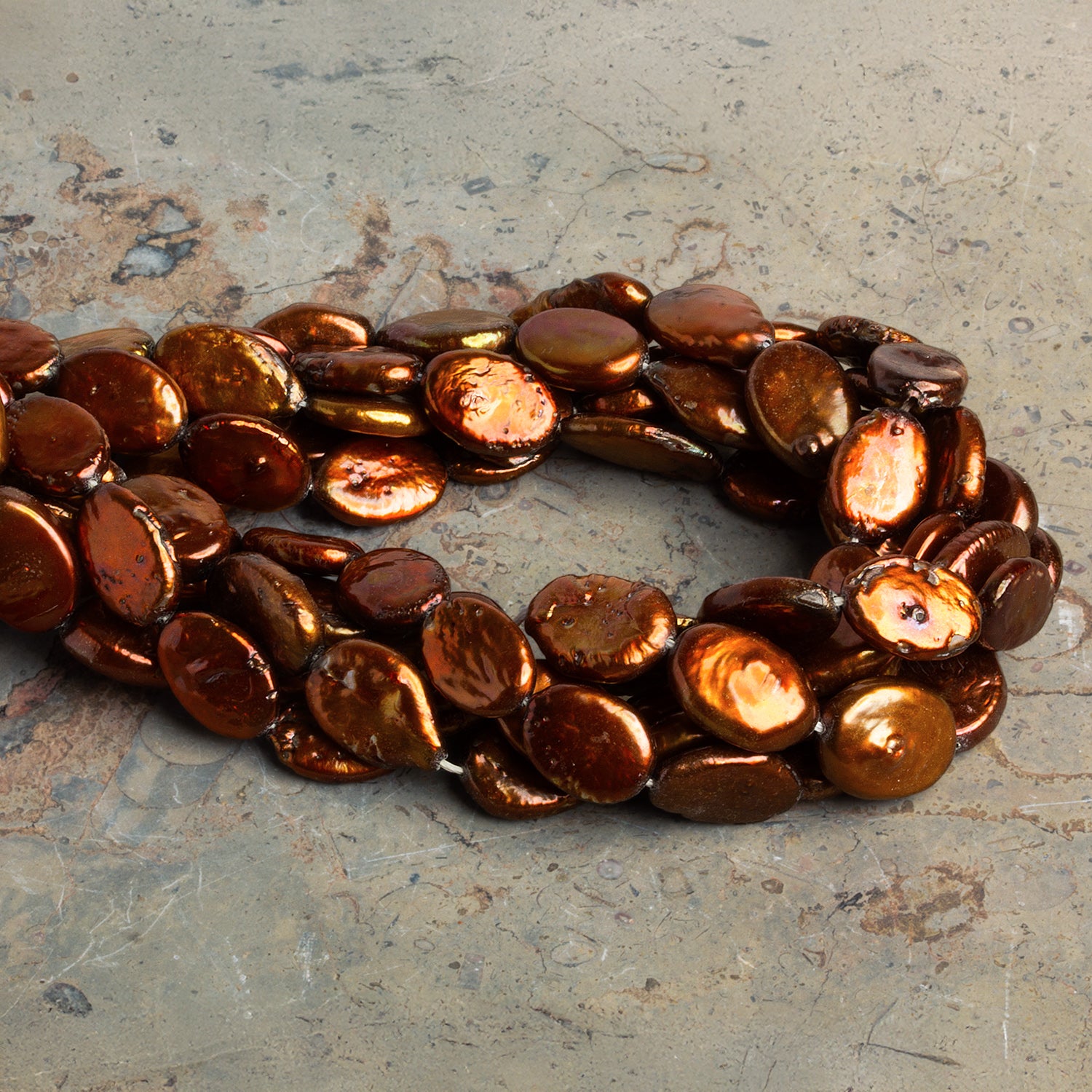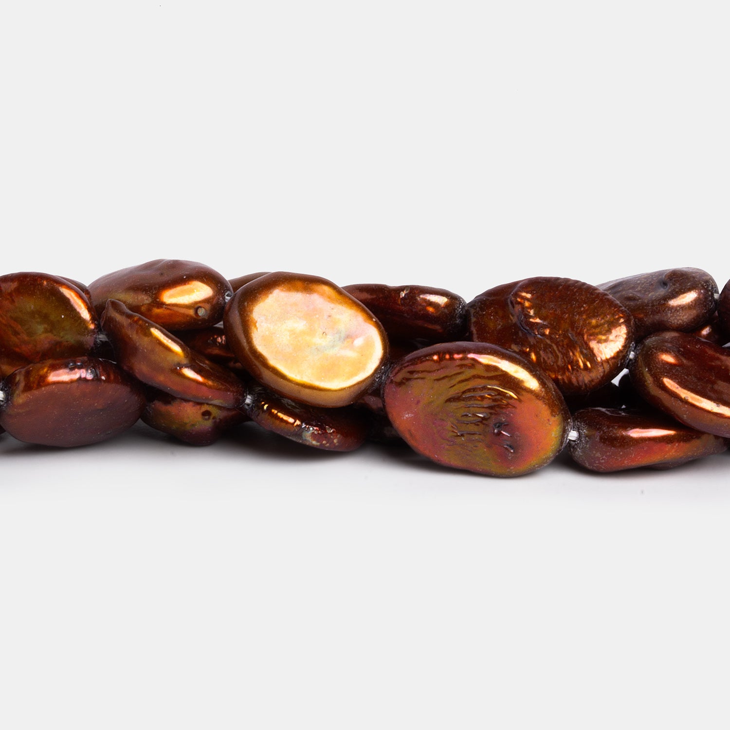 Bring warmth and elegance into your designs with these Copper Brown Straight Drilled Oval Freshwater Pearls. Measuring approximately 12x9mm, each pearl displays a rich, earthy brown hue with radiant copper undertones that shimmer beautifully under the light. Their organic oval form, paired with a smooth luster, highlights the natural textures and individuality of each bead, making them a captivating addition to any jewelry project.