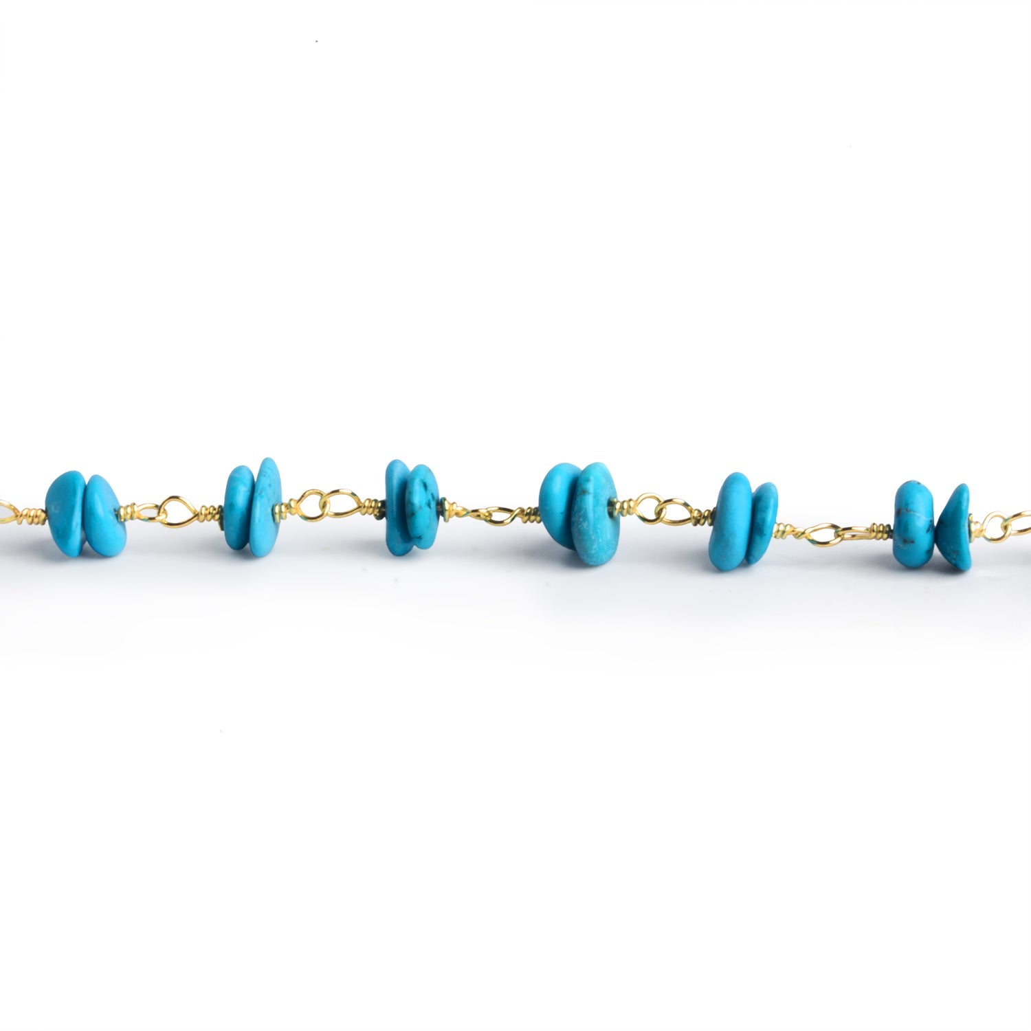 Nuggets average about 6x4mm to 12x6mm. These beads have a consistent Turquoise blue coloration across opaque bodies that stands out on our handwrapped gold plated chain.
