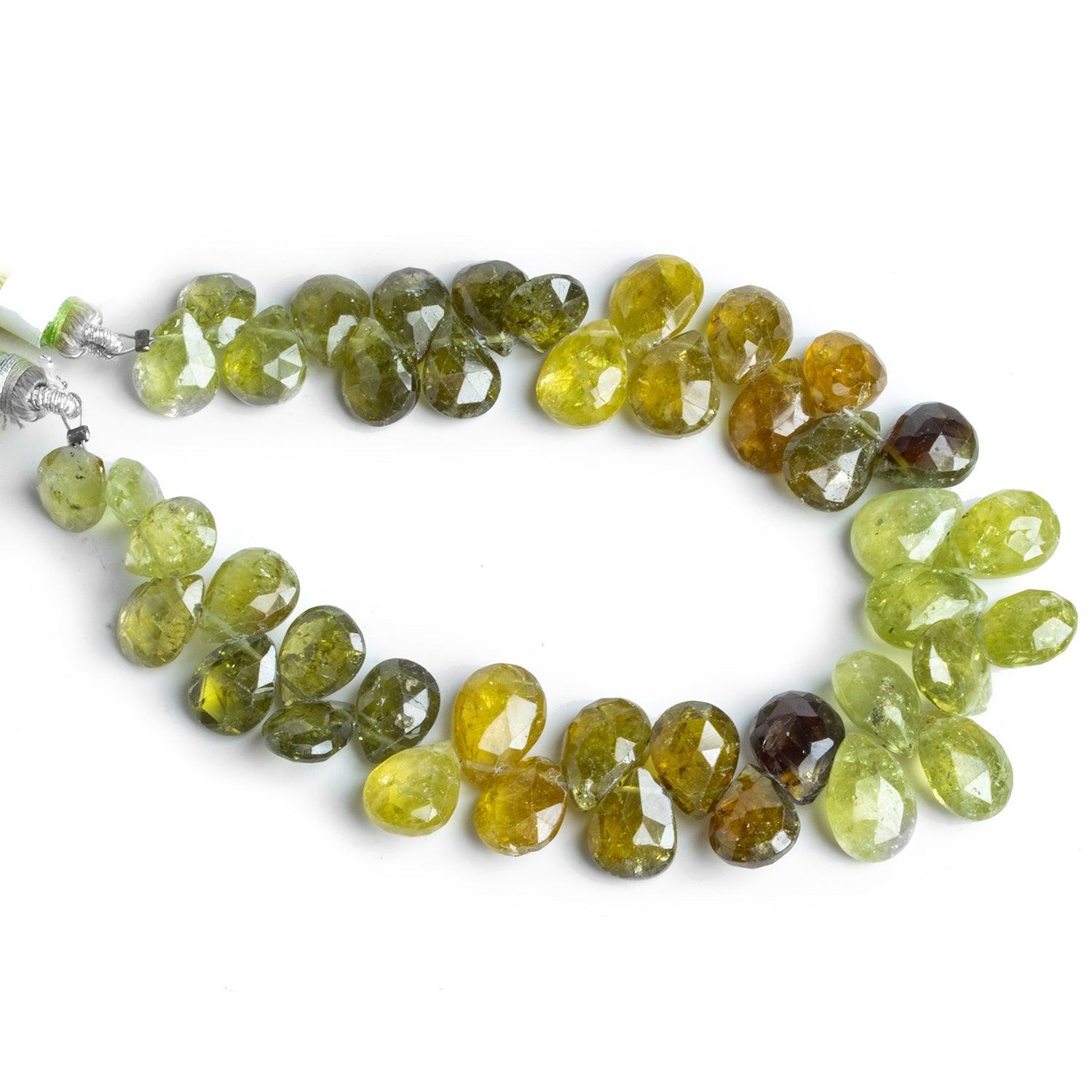 Beads range from about 10x7mm to 12x9mm. This exquisitely crafted strands feature a wide ranging color palette of forest greens and earthy to caramel tones. Expect internal characteristics on these finely faceted and richly colored pears.