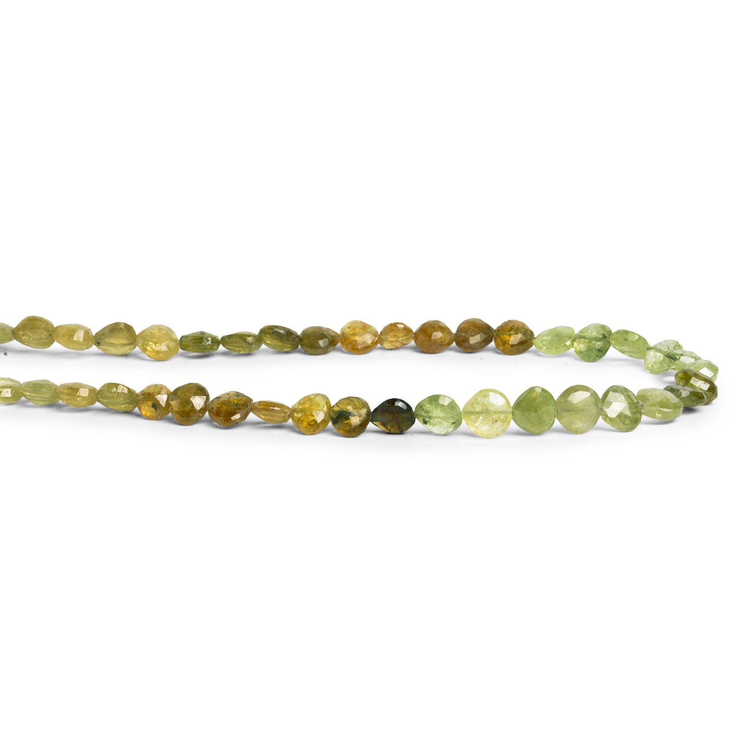These Green Grossular Garnet Faceted Heart Beads measure about 5mm and are cut with precision facets that enhance their natural brilliance. The beads display a lively mix of green shades ranging from fresh spring greens to deeper mossy tones, each accented by sparkling internal textures. Their petite heart shape and straight-drilled orientation make them versatile for creating delicate, yet eye-catching designs.