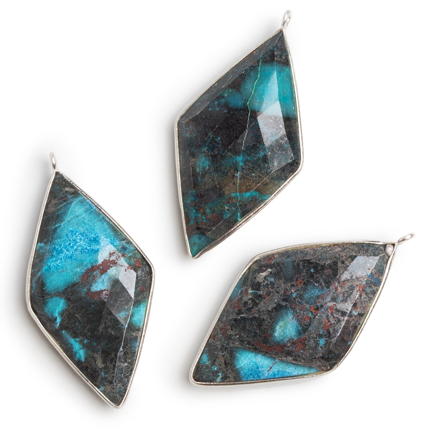 These Silver Bezeled Chrysocolla Kite Pendants are striking, with their unique kite-shaped design and stunning color. Each pendant averages 50x25mm, making them bold and eye-catching centerpieces for your jewelry creations. The vibrant blue and green hues of the chrysocolla are beautifully highlighted by the smooth, shiny silver bezel, offering a modern yet timeless aesthetic. The faceted surface of the gemstone adds a touch of sparkle, drawing attention to the intricate details and natural beauty of the stone. Sold individually, these pendants are perfect for crafting statement pieces, whether in necklaces or earrings, adding a touch of elegance and sophistication to any design.