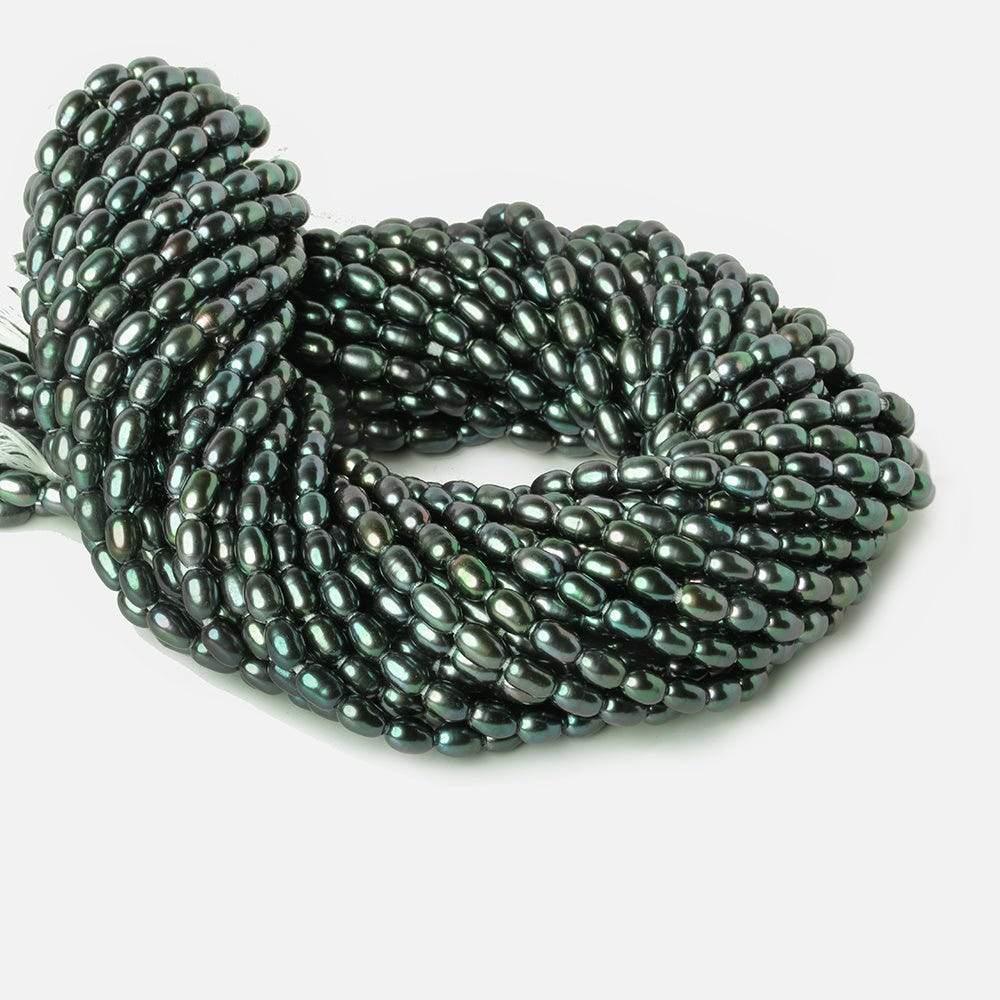Large Hole Straight Drilled Oval Freshwater Pearls have excellent high luster, pearls have excellent nacre, are well matched for quality on strand, are straight drilled with a 1.5mm hole, and are an excellent value for an average size & well made freshwater pearl oval shape. The pearl has a deep green base with a strong iridescent peacock overtone. Large Hole pearls have a 1.5mm inside diameter. The drill holes are produced with a 5 step drill process to insure a cleanly drilled hole without abrasion to the nacre and the drill hole is a consistent diameter through the pearl.