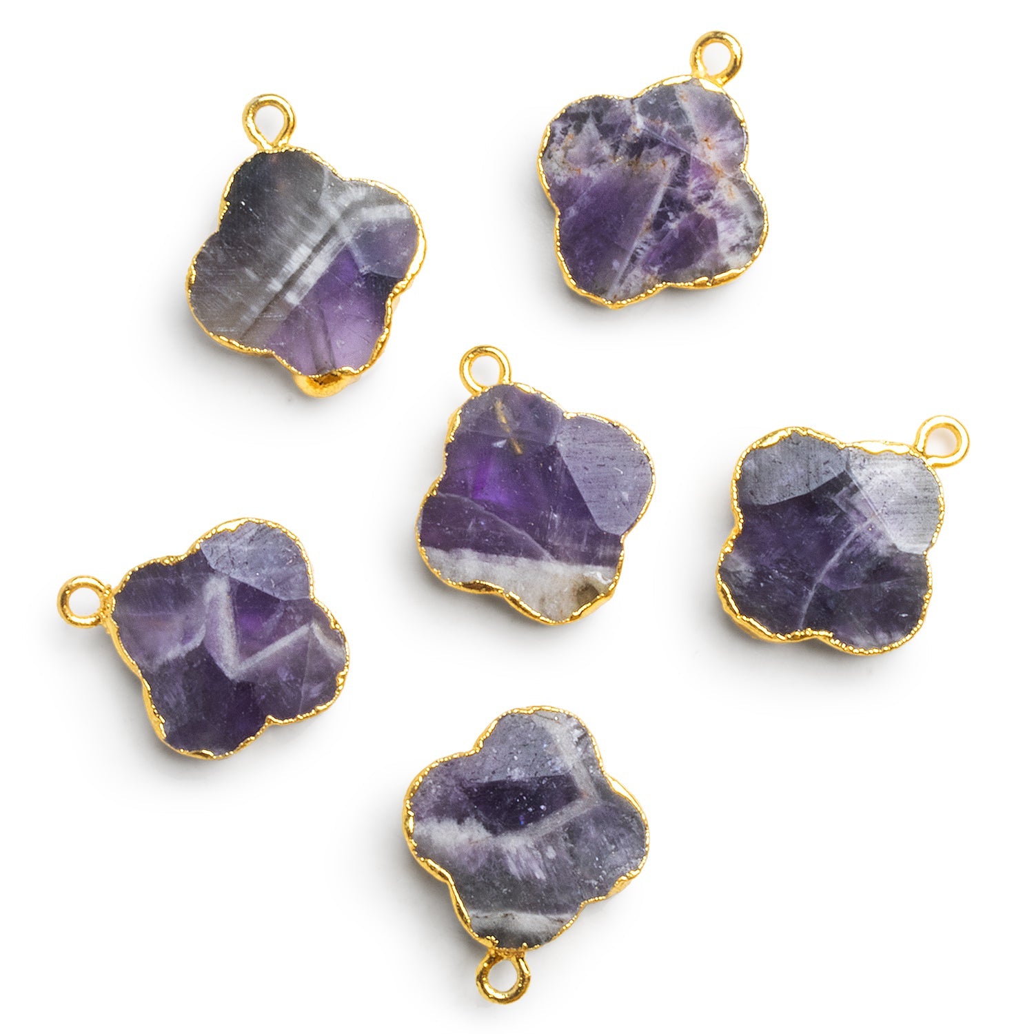 Beads measure about 15mm in diameter. Bring your designs together with a beautiful Amethyst pendant crafted into a unique, rounded flower shape perfect for a wide range of Jewelry designs. These broad-faced offerings show off some of the sought-after chevron texture indicative of Cape Amethyst. Our Flower Pendants look amazing enveloped in our signature gold leaf and are ideal for use as the focal bead of necklaces, earrings and more.
