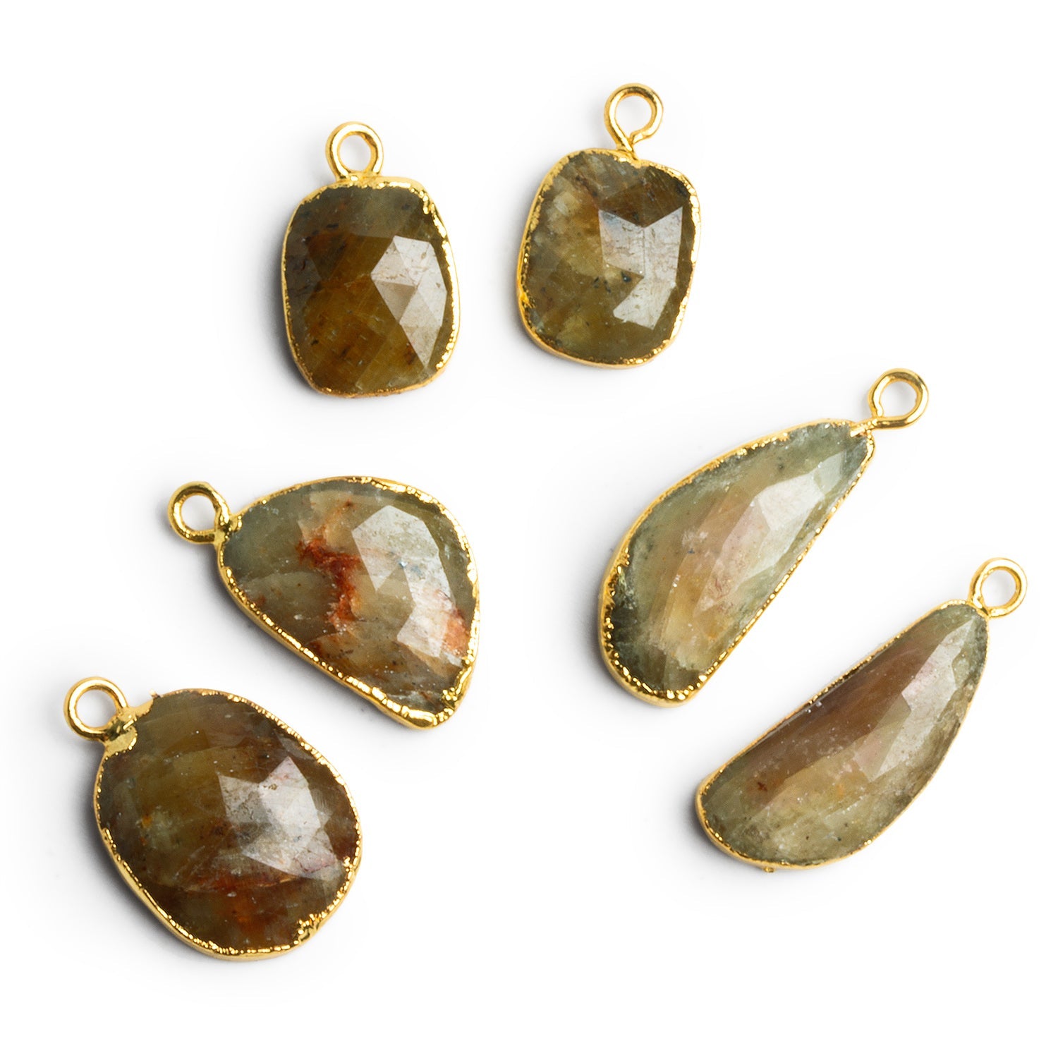 These 15mm gold leafed sapphire pendants feature naturally faceted sapphire in soft, earthy tones ranging from warm honey and olive to muted gray and faint blush, with subtle internal textures that give each stone depth and character. Each sapphire is individually cut and then hand-finished with gold leafing along the edges, creating an organic, irregular frame that highlights the natural outline of the stone rather than forcing it into a rigid shape. The faceted surfaces catch the light gently, offering a refined shimmer without overpowering the natural, raw elegance of the material.