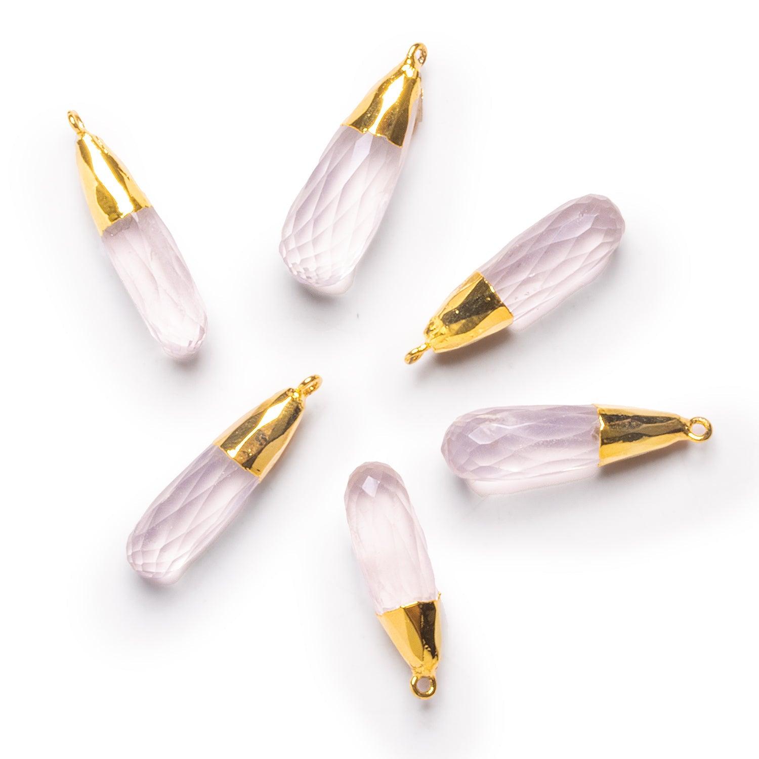 Beads average 24x7mm with very little variation. These gorgeous pieces feature light, slightly milky bodies with a brilliant faceting across slim teardrop bodies. Expect a slight rosy tone on pendants of exceptional clarity that look great in our signature gold leaf.