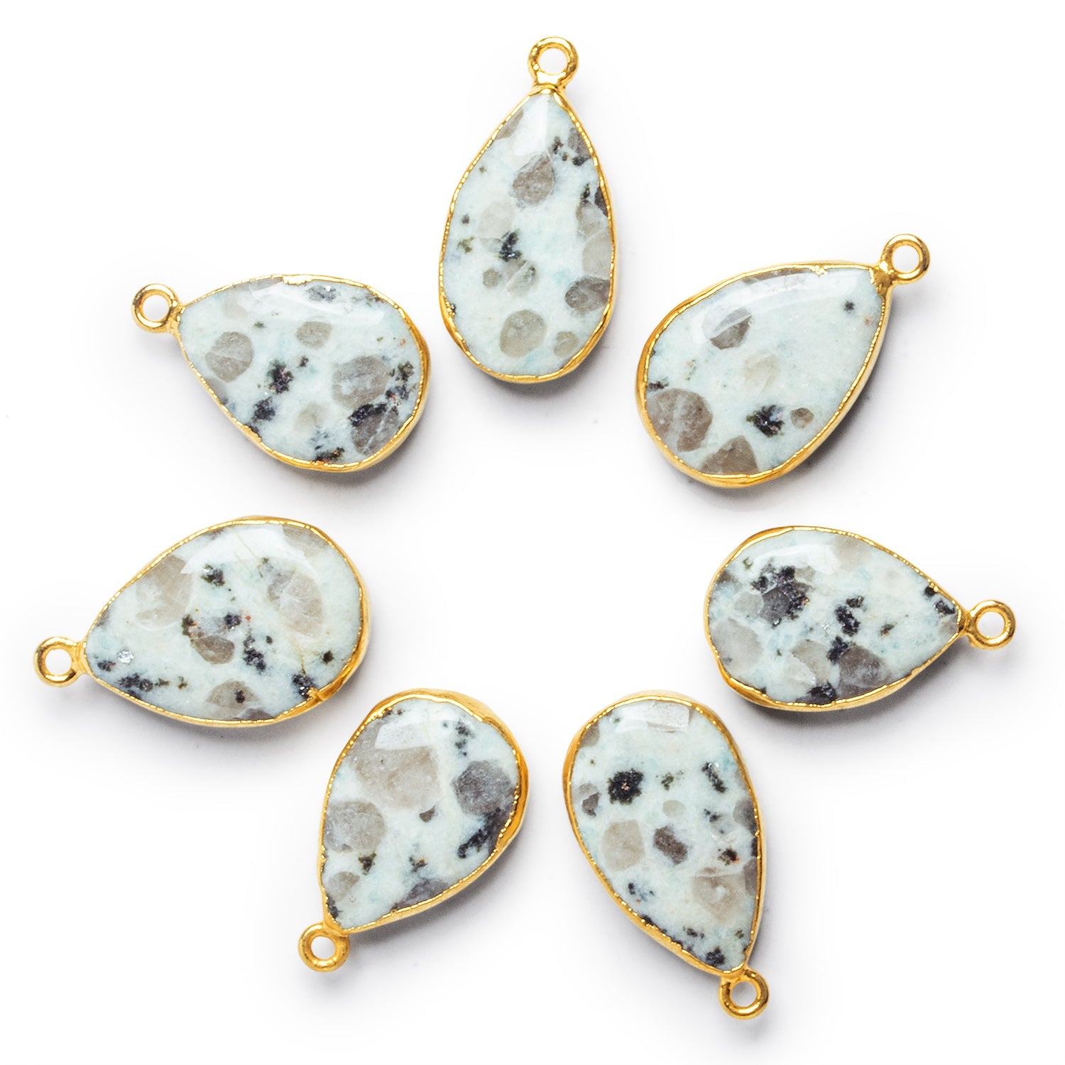 These Gold Leafed Jelly Jasper Pendants feature a soft, natural palette of pale cream and misty grey tones, accented with striking translucent inclusions and darker mottling throughout. Each pear-shaped pendant is outlined in lustrous gold leafing, adding a refined metallic finish that highlights the gemstone’s organic character. The subtle interplay of light and texture across the polished surfaces makes every pendant slightly unique, balancing earthy appeal with a touch of elegance.