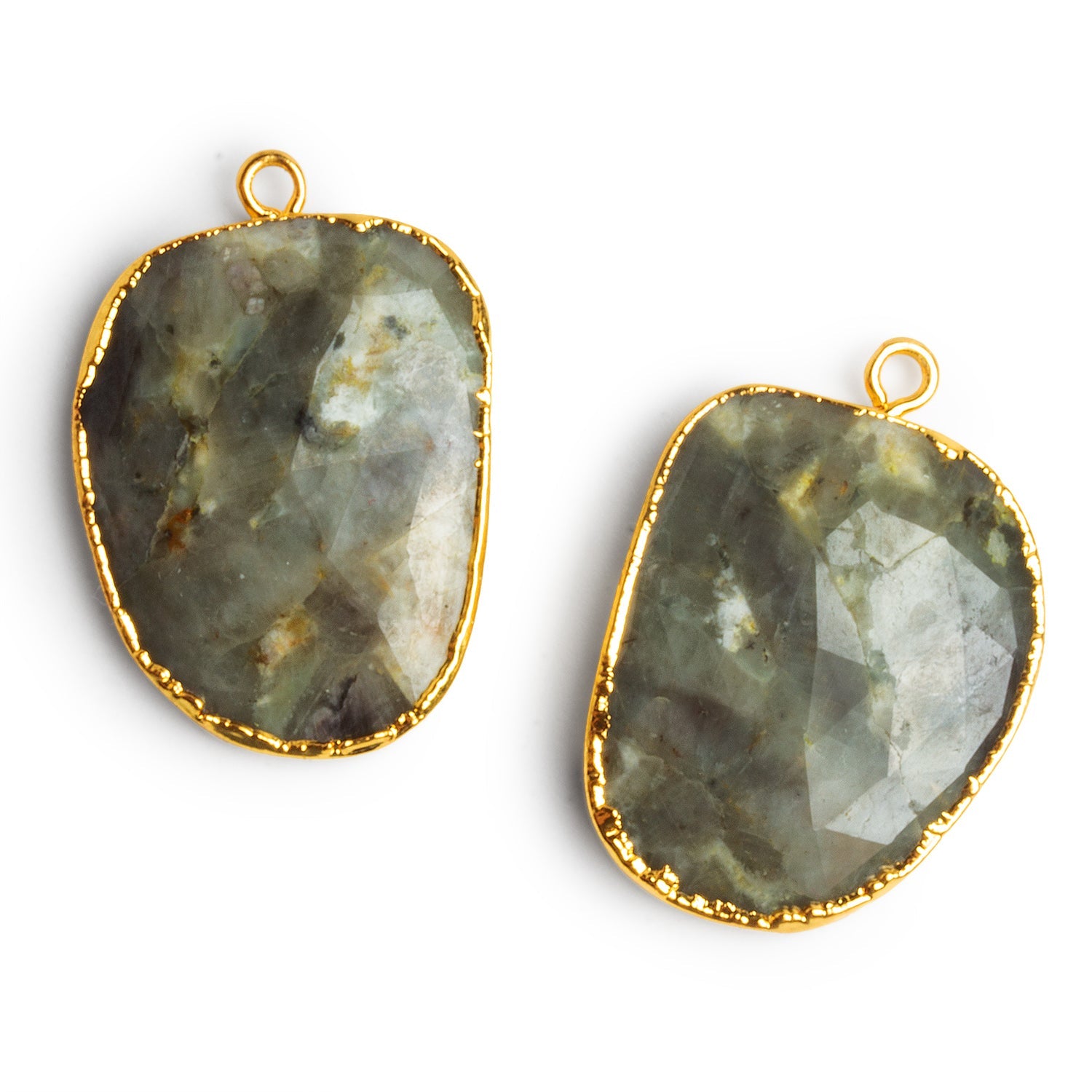 These 28x20mm gold leafed Sapphire pendants feature softly faceted, freeform ovals with misty blue-green to gray tones and natural internal veining that gives each stone a subtle, organic depth. The faceting catches light gently rather than with high sparkle, keeping the look earthy and refined while adding just enough shimmer to highlight the natural character of the sapphire. Each pendant is framed with a bright gold leafed edge and finished with a matching loop, creating an elegant contrast between raw gemstone texture and polished metal detail.