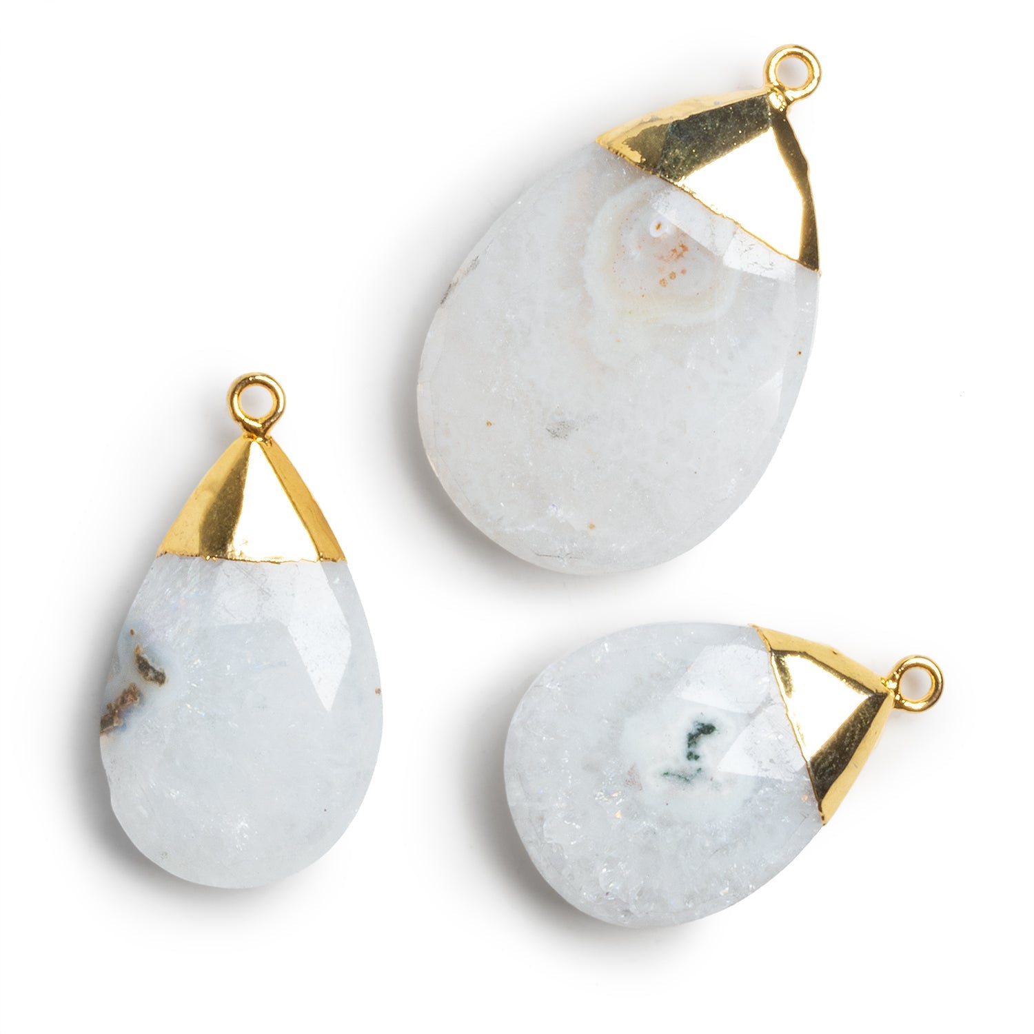 Beads measure about 34x18mm. These gorgeous, sizable pendant pieces feature high-quality Solar Quartz with its beautiful crystal structure on full display. Finished off in our gold leaf, these bold designs are sure to catch the eye as the focal bead of necklaces, as earrings, and more!