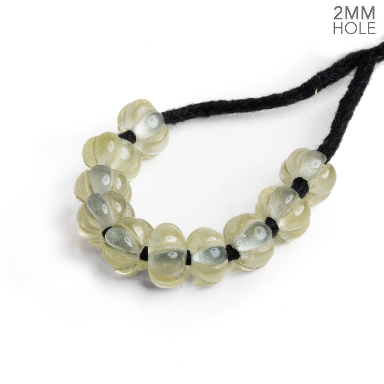 Beads measure about 7mm to 8mm in diameter with a 2mm large drill hole. These beautiful offerings show off hand carved craftsmanship on lightly colored Lemon Quartz designed to fit with the widest array of cording medium possible. Our versatile Melons are destined to dazzle in jewelry designs from necklaces to earrings and bracelets. Consider these unique pieces when sitting down to your next slate of creations, perfect for stringing on thick leather, showing off a handmade aesthetic and much more.