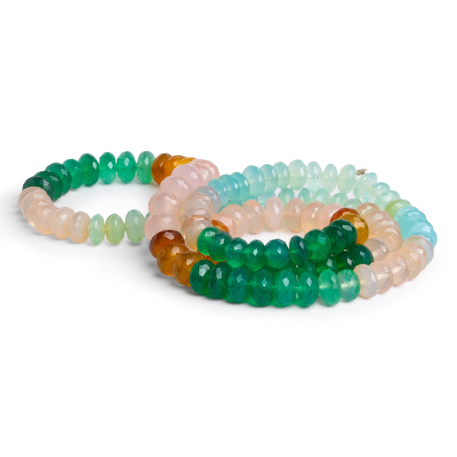 Bring an infusion of lively color and precision craftsmanship to your jewelry designs with these Multi Gemstone German Faceted Rondelle Beads. Measuring between 6.5mm and 8mm, each bead is cut with fine German faceting, giving them a crisp brilliance that enhances the natural beauty of their tones. This strand features a striking palette of gemstones in greens, teals, honeyed yellows, warm ambers, and soft blush hues, making it a versatile choice for bold or subtle creations alike.