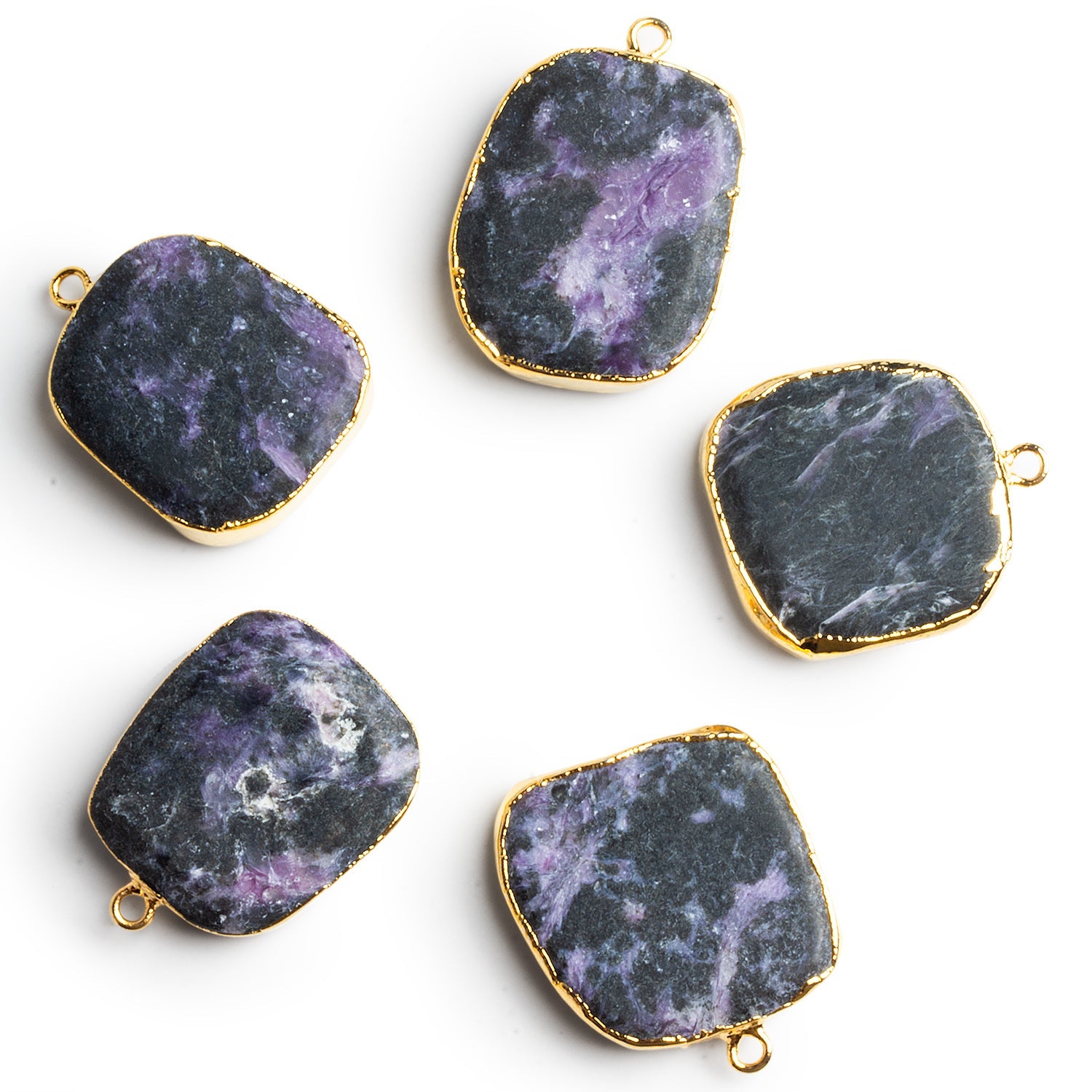 These 26x20mm Gold Leafed Charoite Nugget Pendants showcase the dreamy, swirling violets and inky blacks that make natural Charoite so unmistakable. Each pendant features a free-form, organically shaped nugget cut from premium rough, chosen for its dramatic marbling and velvety color transitions. The stone surface retains a soft, natural texture while still offering that subtle sheen Charoite is loved for. Every piece is individually wrapped by hand in radiant gold leafing that highlights the stone’s contours, giving each pendant a balanced blend of rustic earthiness and refined metallic elegance.