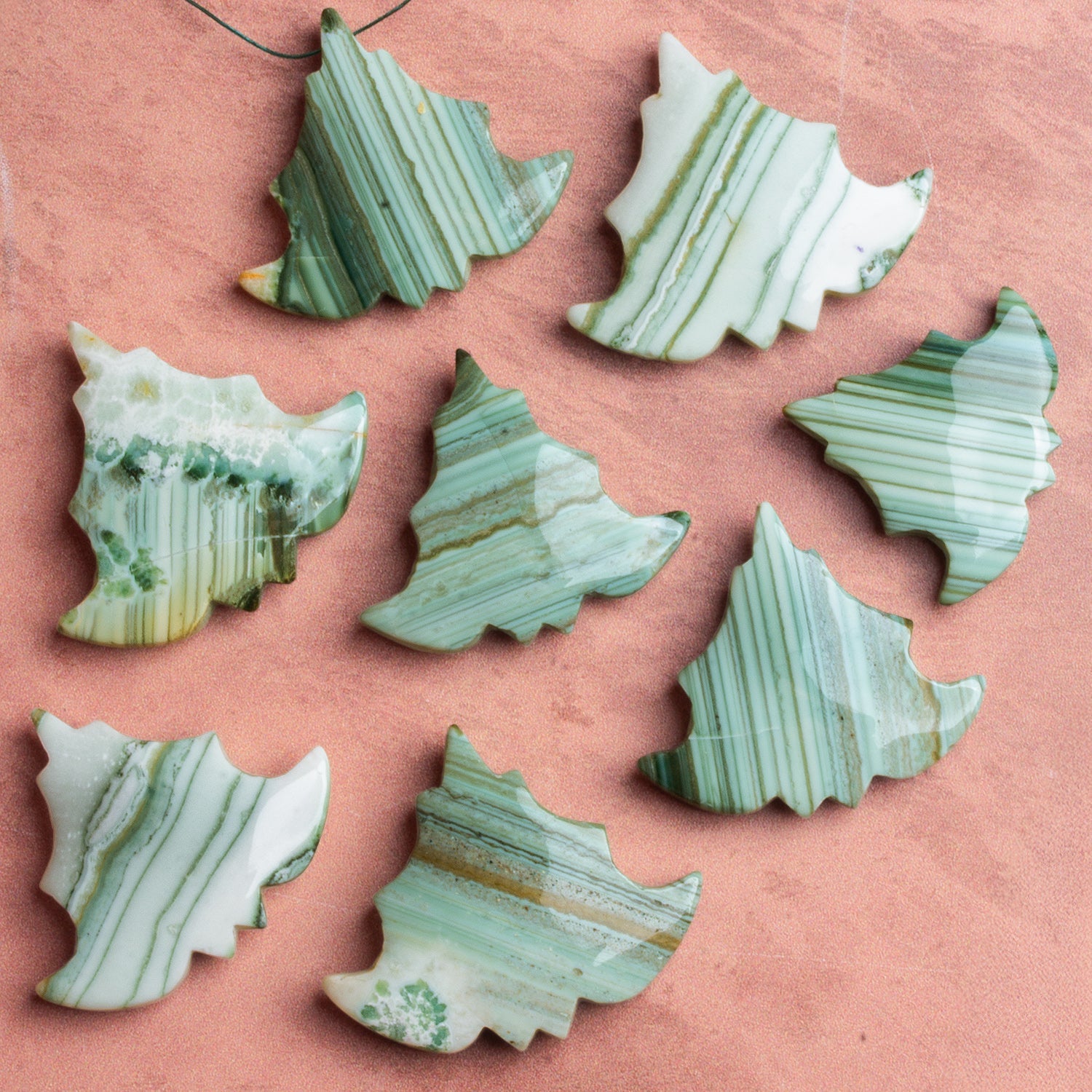 Carved from natural jasper, these tree-shaped focals feature beautiful earth-toned striping in soft greens, creams, and mossy accents—each one uniquely patterned by nature. The polished surface highlights the stone’s banding and organic texture, giving every bead its own “woodland landscape” effect.