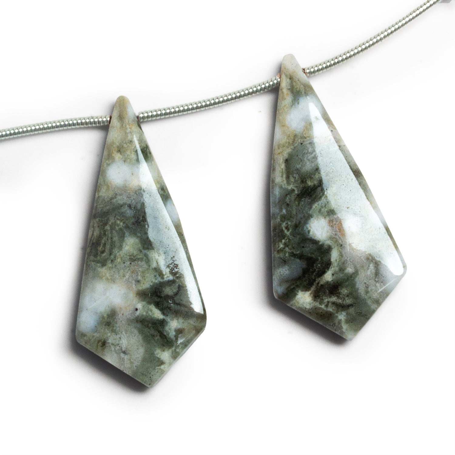 These Jasper shield focals display a stunning interplay of earthy greens, misty grays, and soft cream tones, evoking the natural beauty of moss-covered stone. Each focal is shaped into a sleek, tapered shield form and polished to a glossy finish that enhances the stone’s unique marbled patterning and organic texture.