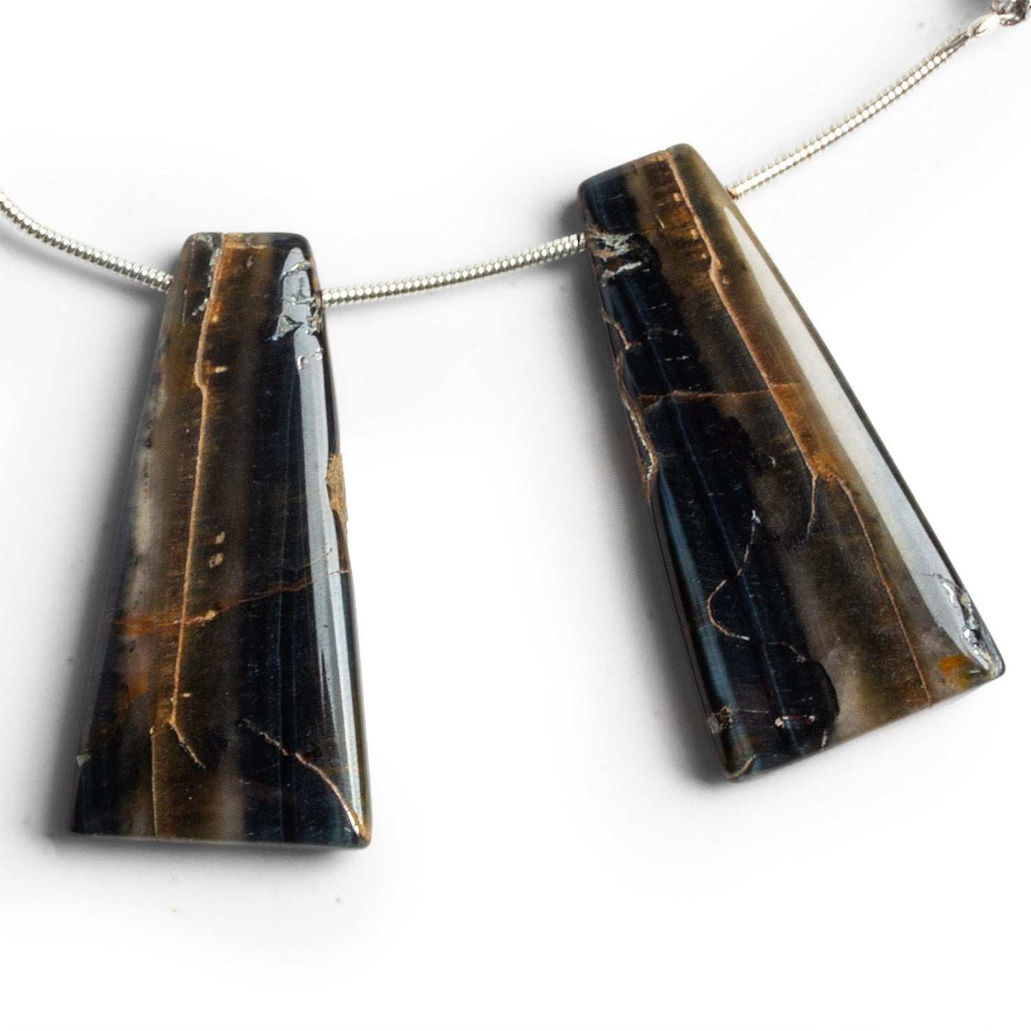 These Jasper fan focals feature striking bands of deep espresso brown, honey gold, and jet black layered in a natural gradient that feels both dramatic and refined. Their glossy polish enhances the stone’s organic texture and reveals subtle mineral veining throughout each surface.