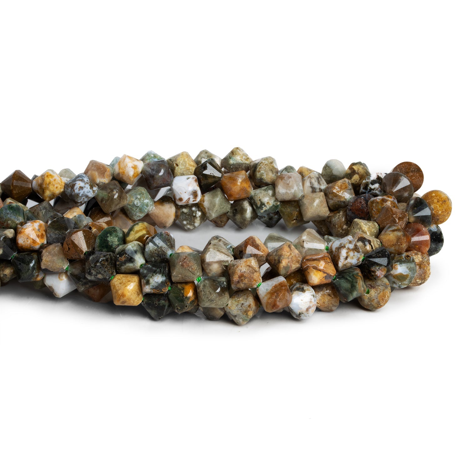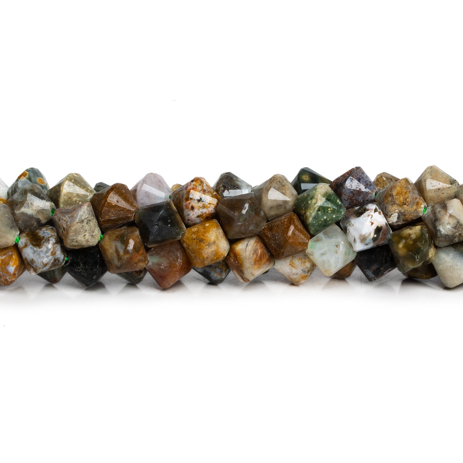 Beads measure about 8mm in diameter. These exciting bicone shapes feature a subtle faceting that highlights the myriad colors and textures unique to ocean jasper. Experience deep greens, marble whites along with a range of greys and earth tones for an organic look on a geometrically intriguing bead shape. These curated beauties are perfect for a range of Jewelry Designs, from necklaces to bracelets and earrings!
