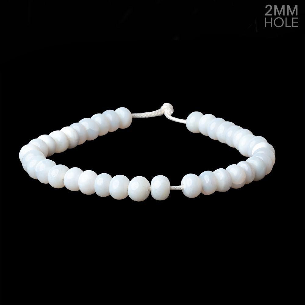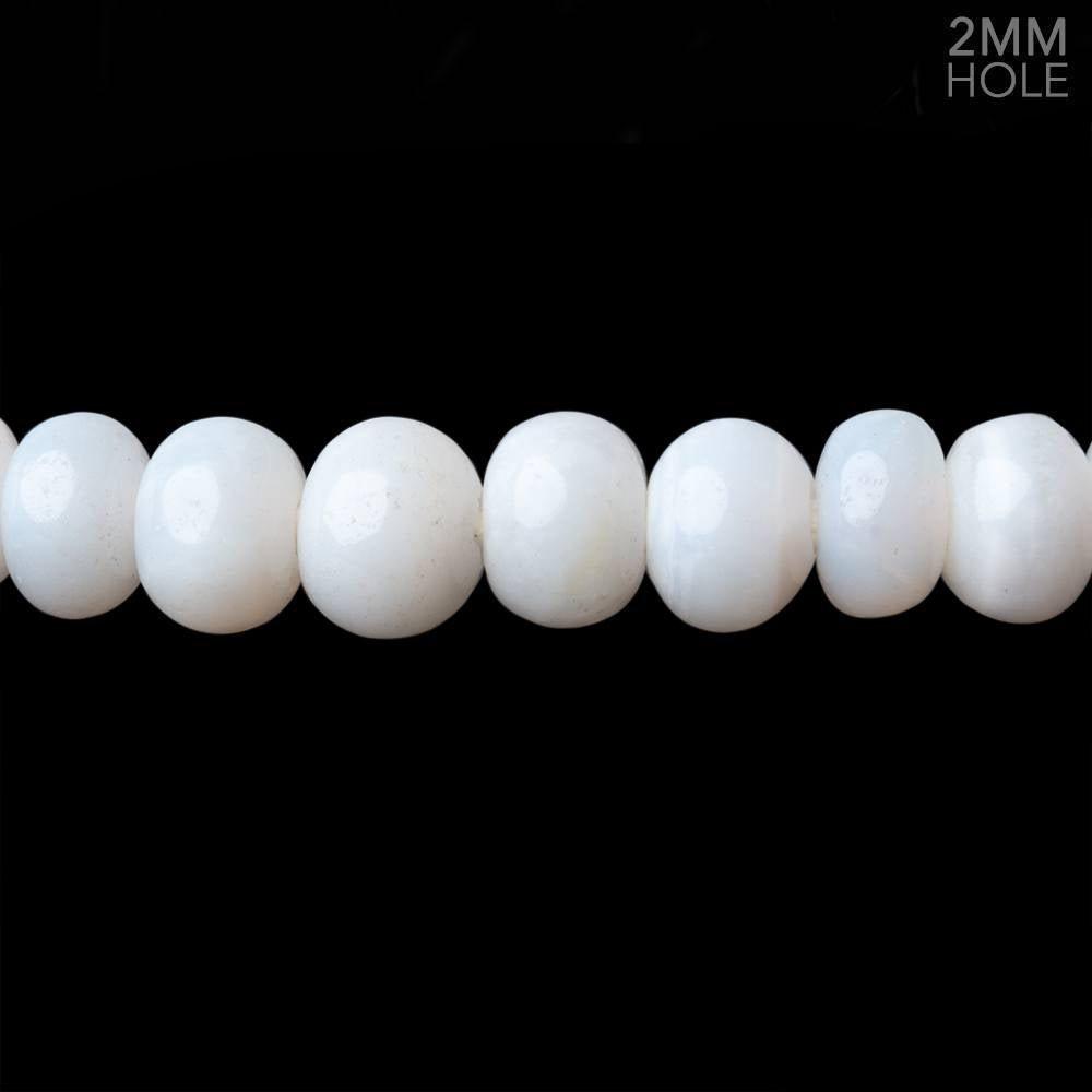 8mm to 8.5mm White Opal unfaceted rondelles have a 2mm inside diameter drill hole with a waxy luster, good polish and a symmetrical shape. These opals are untreated white common opals with semi opaque bodies.