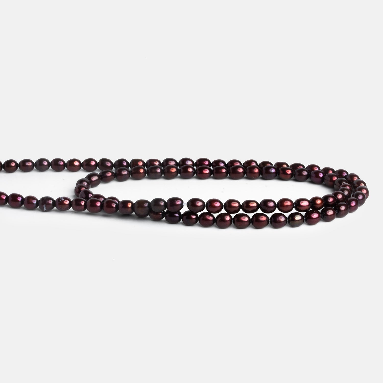 These rich burgundy freshwater pearls feature a deep wine-toned luster with flashes of rose, plum, and coppery undertones that shift subtly in the light. Their smooth oval shape and high-gloss nacre give them a refined, classic look, while the saturated color adds drama and warmth that feels both timeless and modern. Each strand shows natural variation in tone and reflection, lending an organic elegance that synthetic finishes simply can’t replicate.