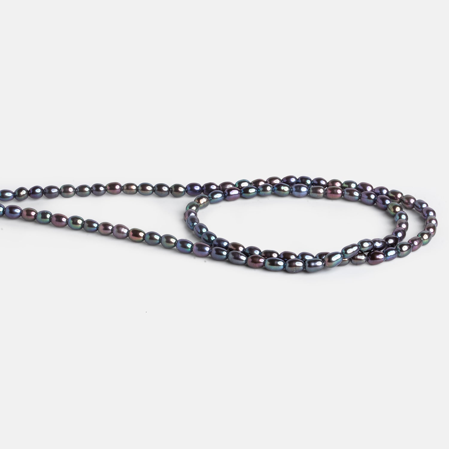 These 5x3mm Peacock Oval Pearls feature a rich, dark iridescence with layered tones of charcoal, oil-slick green, deep violet, and flashes of blue that shift subtly as the light moves across their surface. Their petite oval shape offers a refined, organic look with a softly luminous finish, making them especially well suited for delicate, detail-driven designs. The peacock coloration adds depth and drama without overpowering, delivering a classic pearl feel with a modern, moody edge.