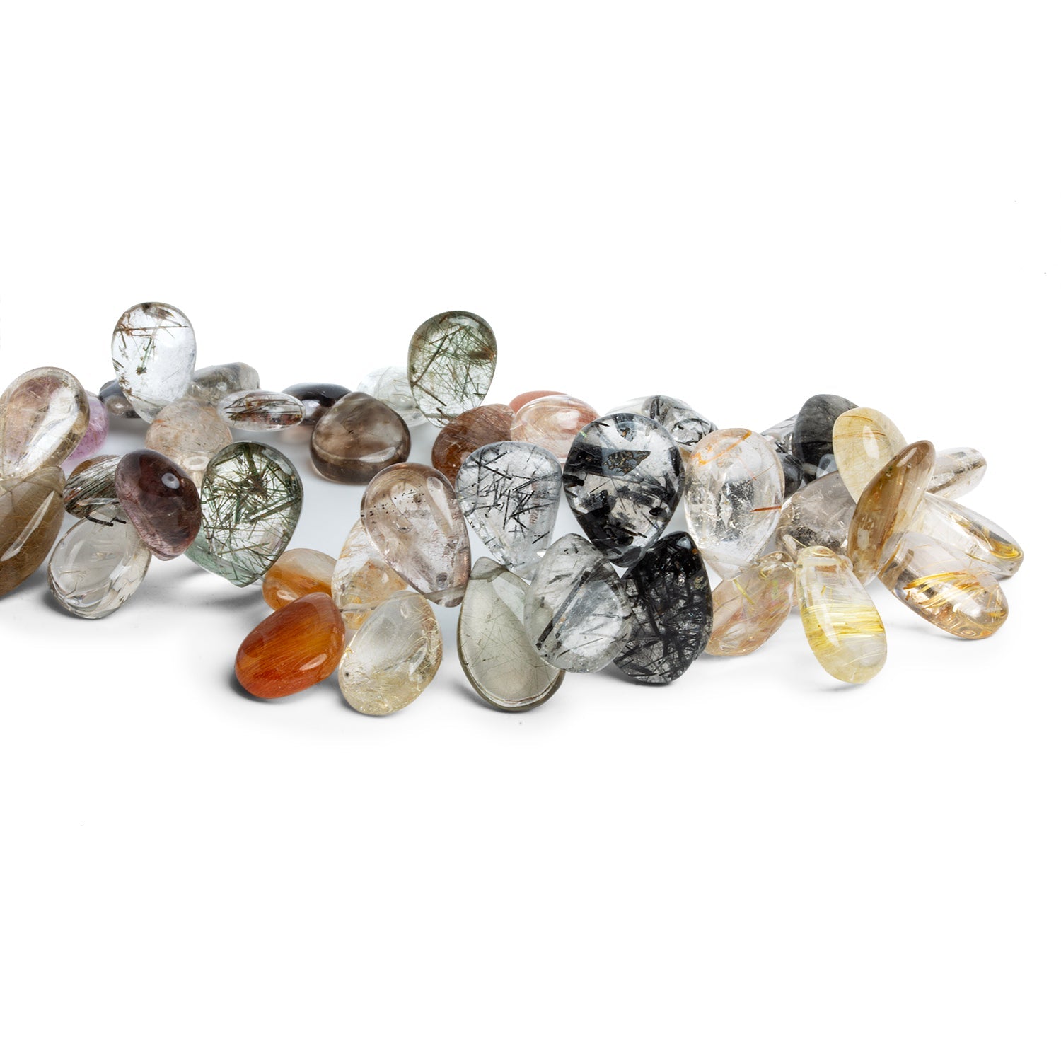 These Tourmalinated Quartz Plain Pear Beads, averaging 14x9mm, showcase a striking interplay of clarity and texture, with delicate black and green tourmaline inclusions suspended within crystal-clear quartz. Each pear-shaped bead is naturally unique, featuring patterns that range from fine, hair-like threads to bold, dramatic streaks, alongside warm golden, earthy brown, and subtle orange tones. The smooth polish enhances their transparency and depth, creating an elegant balance between organic inclusions and a refined finish.