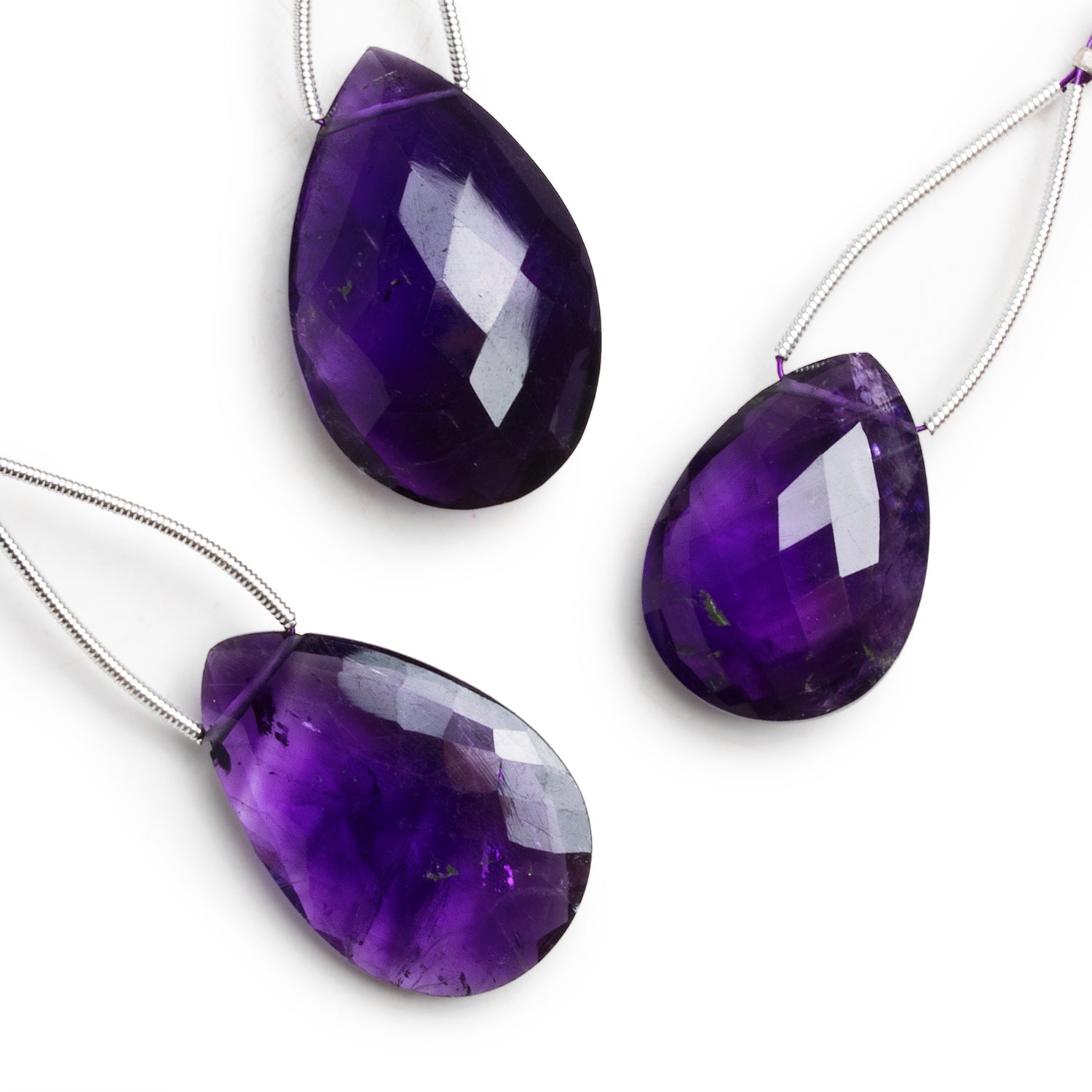 These stunning Amethyst Faceted Pear Focal Beads are single-stone treasures, each measuring approximately 23x17mm. Their deep, regal purple hue is beautifully accentuated by expertly cut facets that enhance their natural brilliance and light reflection.