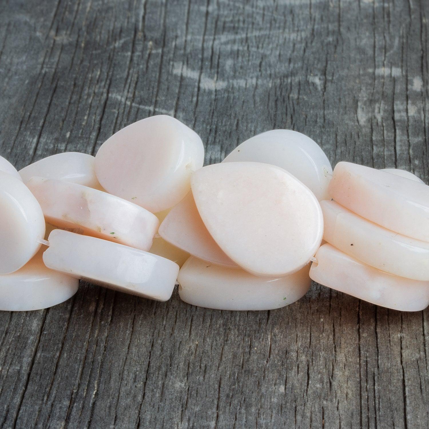 Beads measure about 20x15mm. That sizable pieces show off a creamy pink tone on a unique shape with a thick edge. These beautiful, genuine Pink Peruvian Opal pieces are destined to star in a wide range of bold jewelry designs.