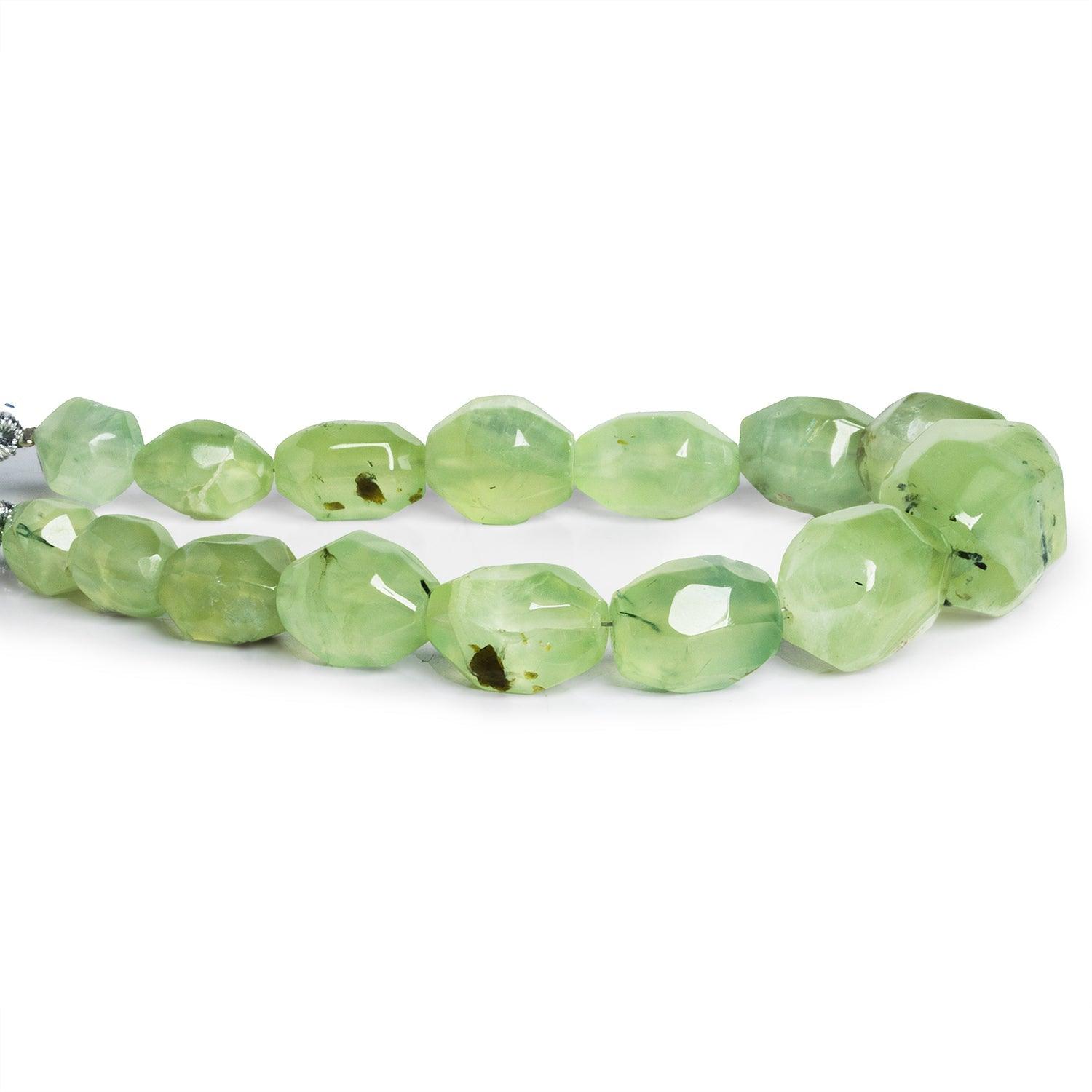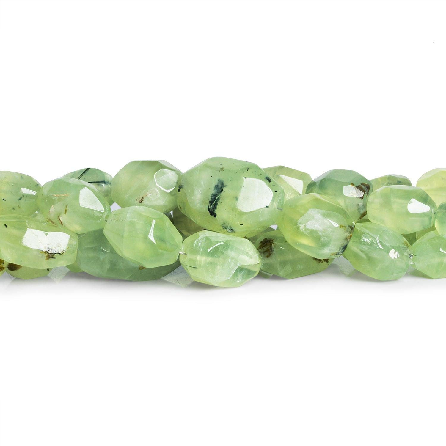 Beads measure about 9x8mm to 21x16mm. These sizable Prehnite pieces feature a tumbled nugget shape with the look of broad facets on a somewhat oval shape. Expect the milky body and alluring green color familiar to fans of Prehnite filled with the mossy and black inclusions that make this gemstone a perennial favorite.