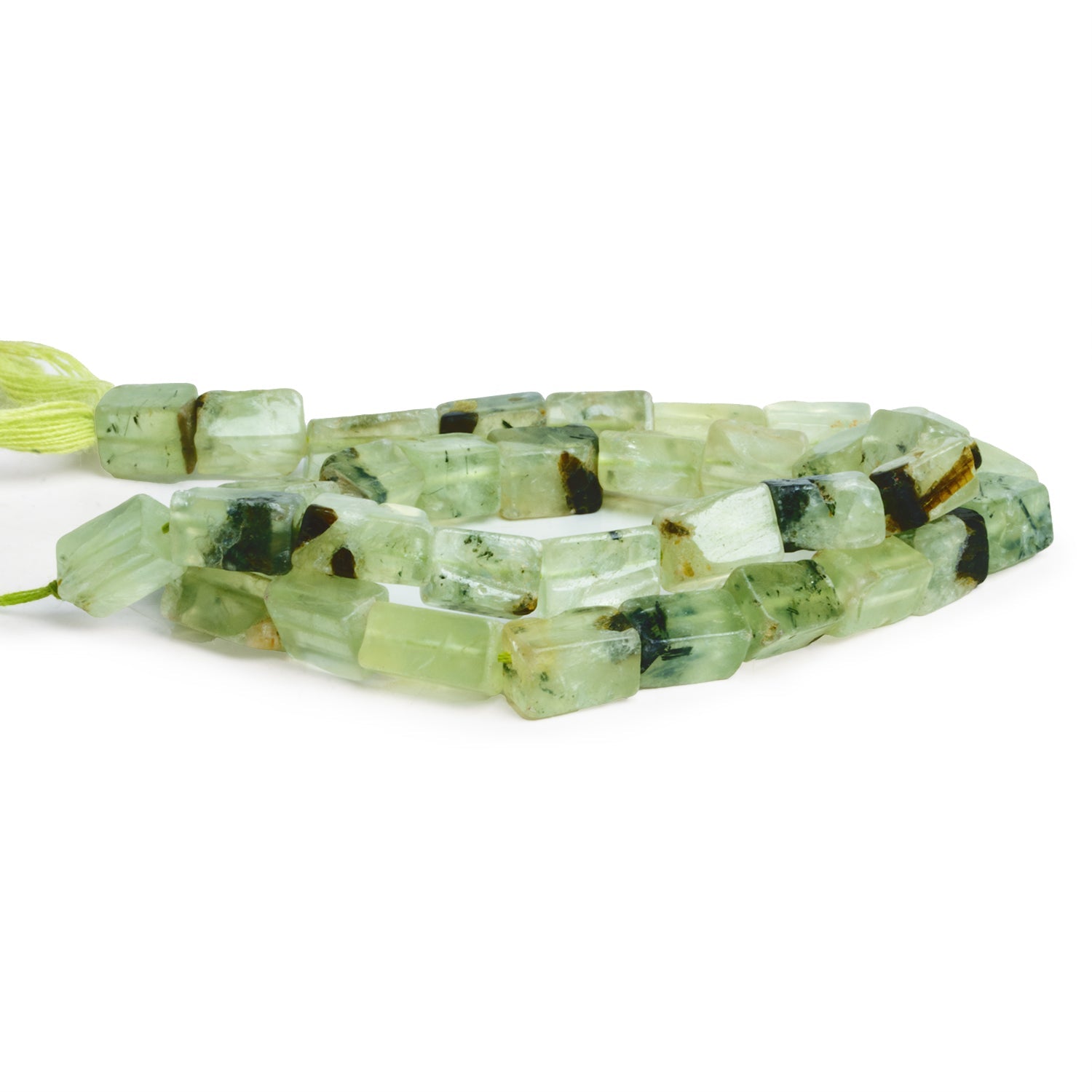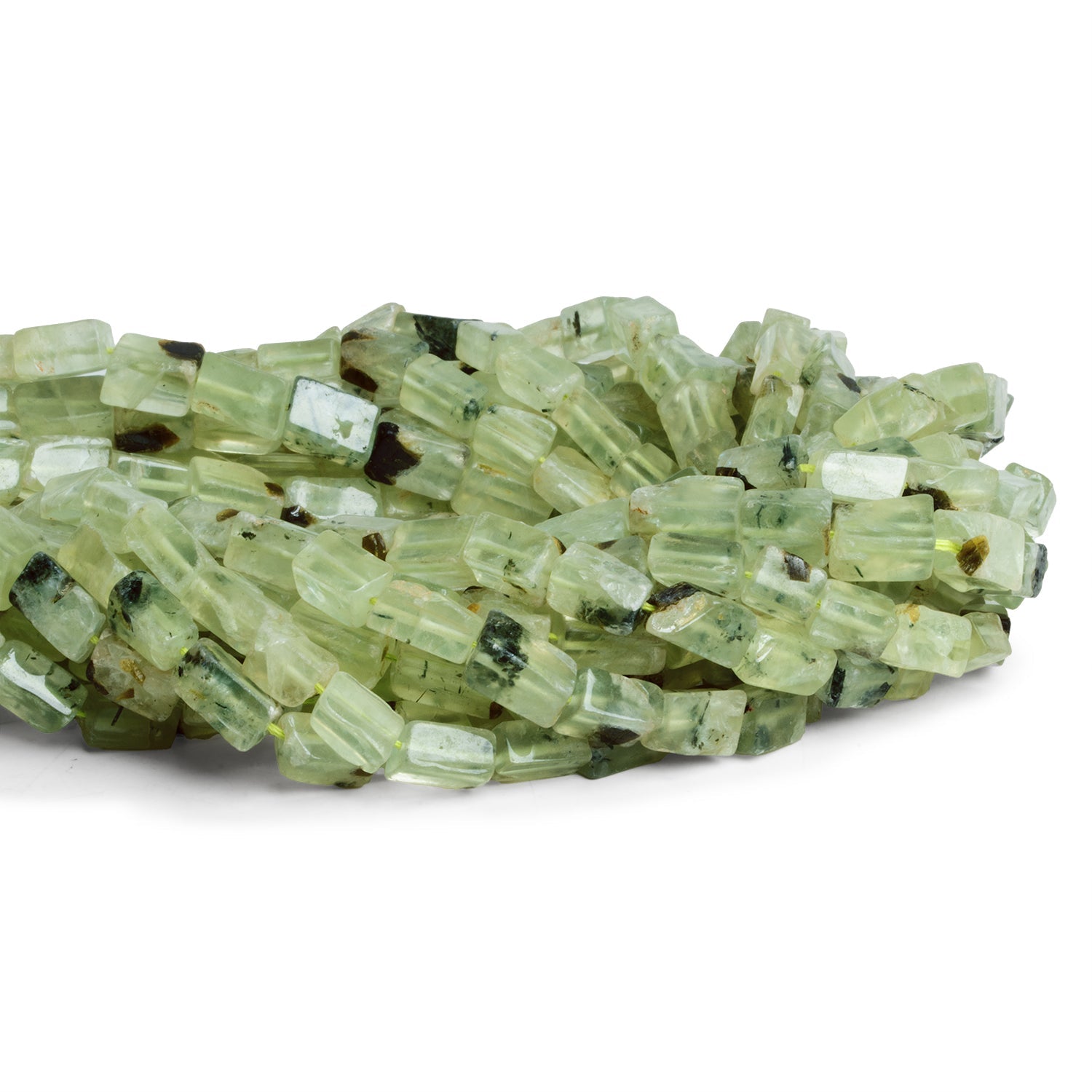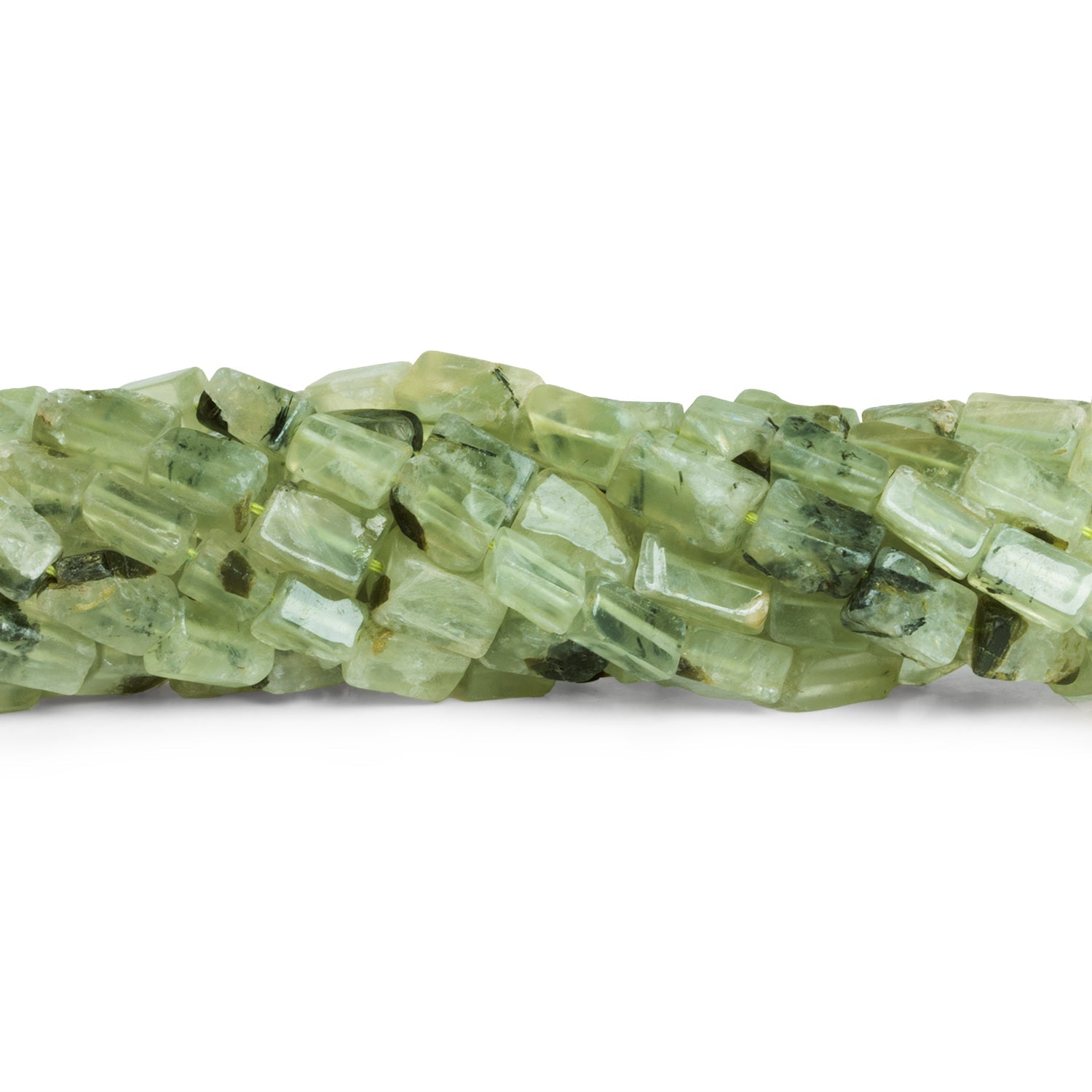 Beads measure about 7x5mm to 10x6mm. These alluring Prehnite pieces show off a boxy rectangle shape with smooth polished faces and show naturalistic irregularities that impart an enhanced organic appearance. Fans of Prehnite will love these light green color palette full the mossy textures and milky bodies that make this unique gemstone a perennial favorite. These curated strands are ideal for use in a wide range of Jewelry Designs from necklaces to earrings and more.