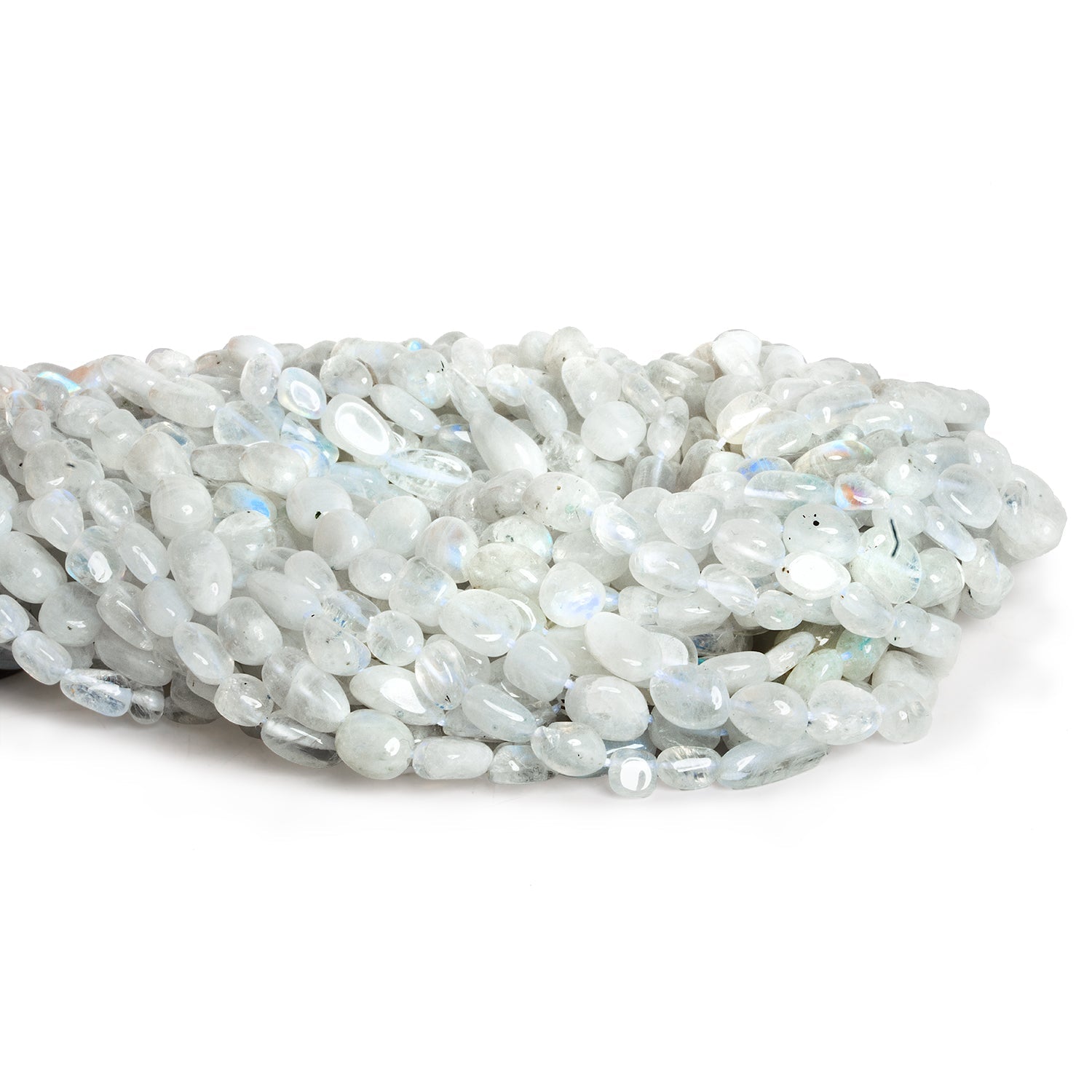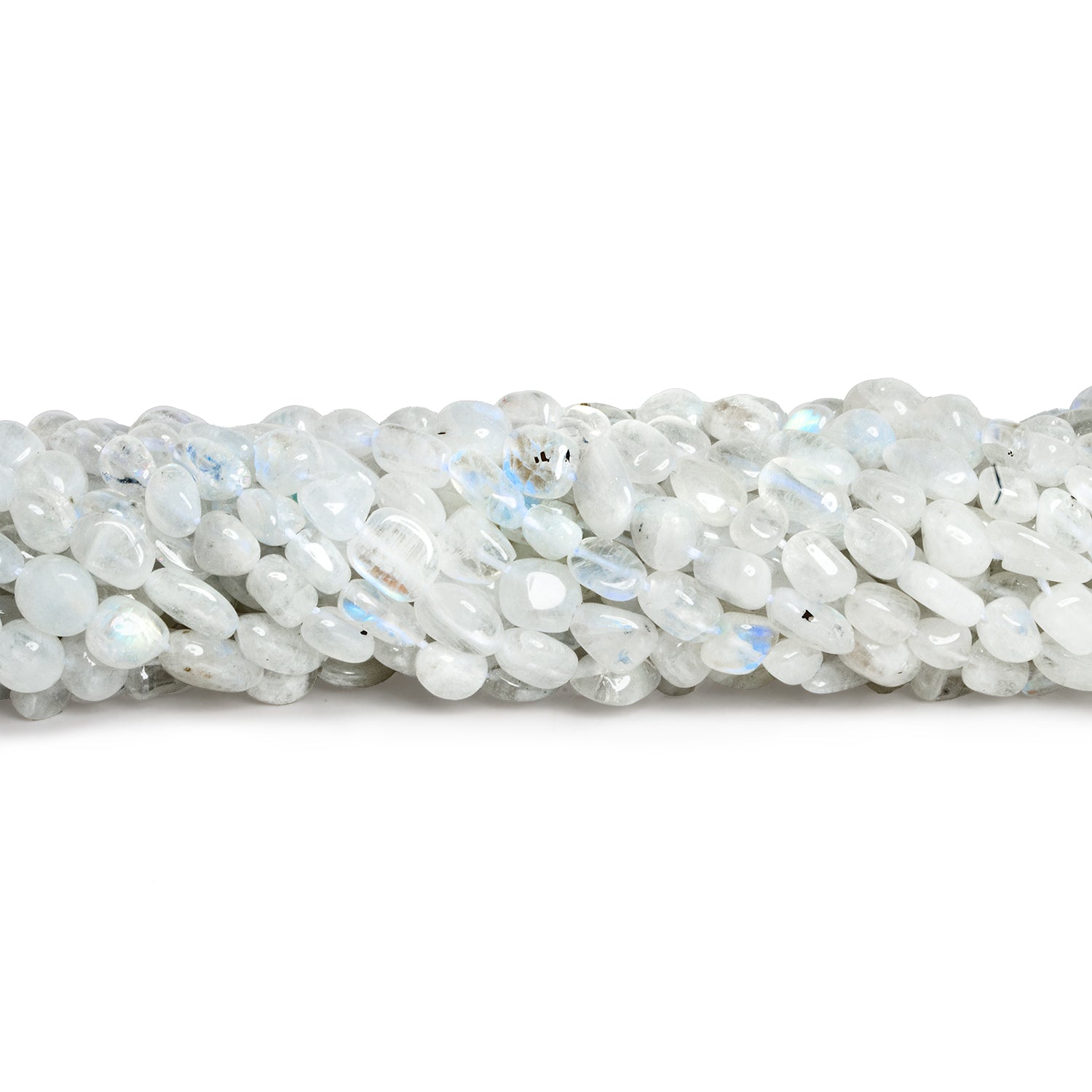 Beads range from about 6x4mm to 9x5mm. These beautiful Rainbow Moonstone pieces feature stark white, cloudy bodies filled with vibrant blue flash. Expect a somewhat irregular nugget shape with a smooth polish.