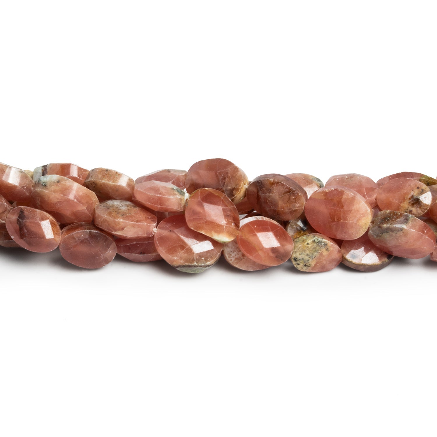 These Rhodochrosite Faceted Oval Beads showcase the warm, earthy beauty of this treasured gemstone in soft shades of rose, peach, and reddish-brown. Each bead is carefully cut into an oval form and finished with light faceting, which enhances the natural luster and highlights the unique mineral inclusions that make Rhodochrosite so distinctive. Measuring between 8x6mm and 10x8mm, these beads strike an ideal balance of delicacy and presence, perfect for jewelry that radiates both elegance and individuality.