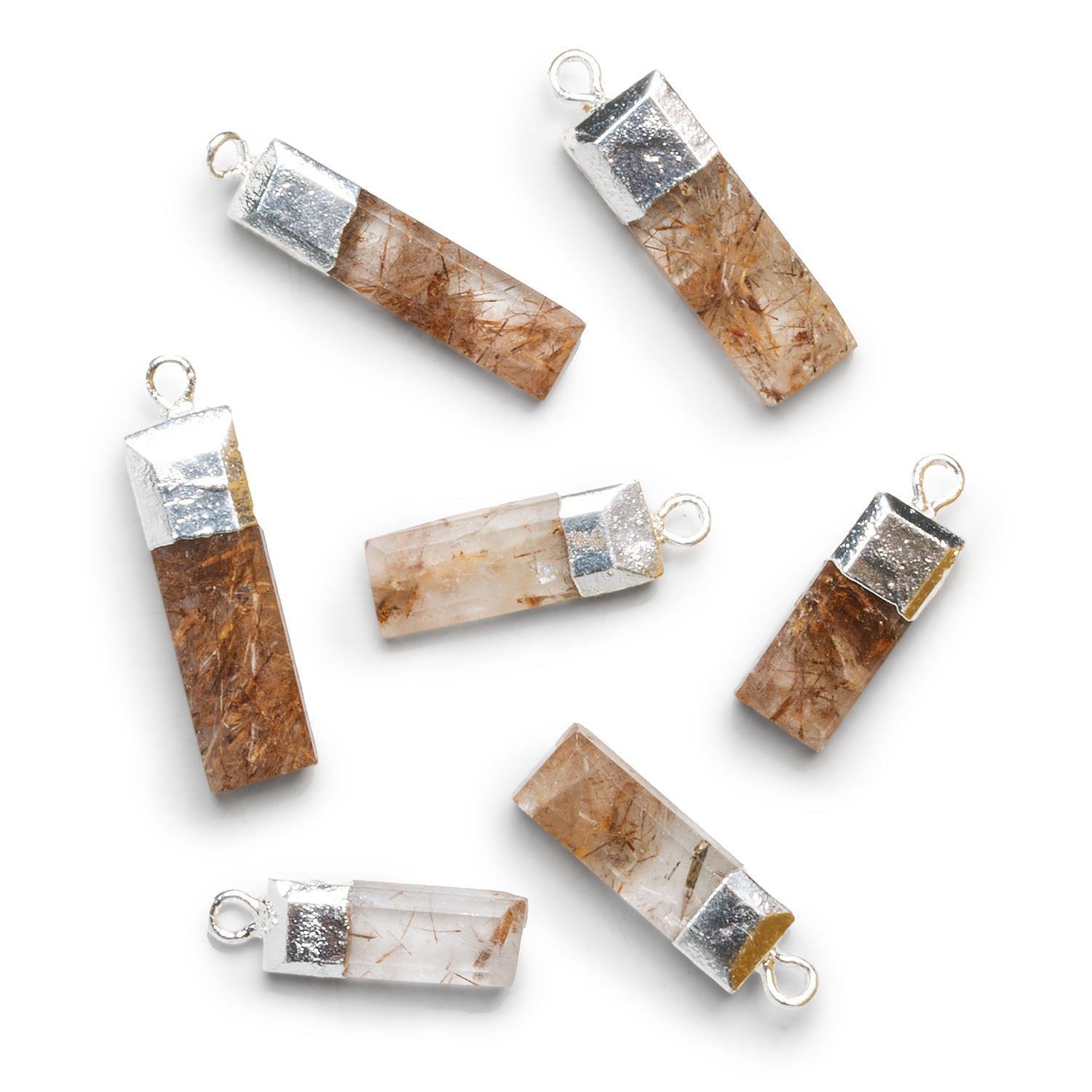 Beads average about 24x7mm with a few mm of variation possible. These beautiful pieces feature a thick and angular texture of copper-toned rutilation throughout the pendant bodies. Our specially curated beauties pair wonderfully with our signature silver leaf and make for the ideal focal bead in a variety of Jewelry Designs from necklaces to earrings and more!