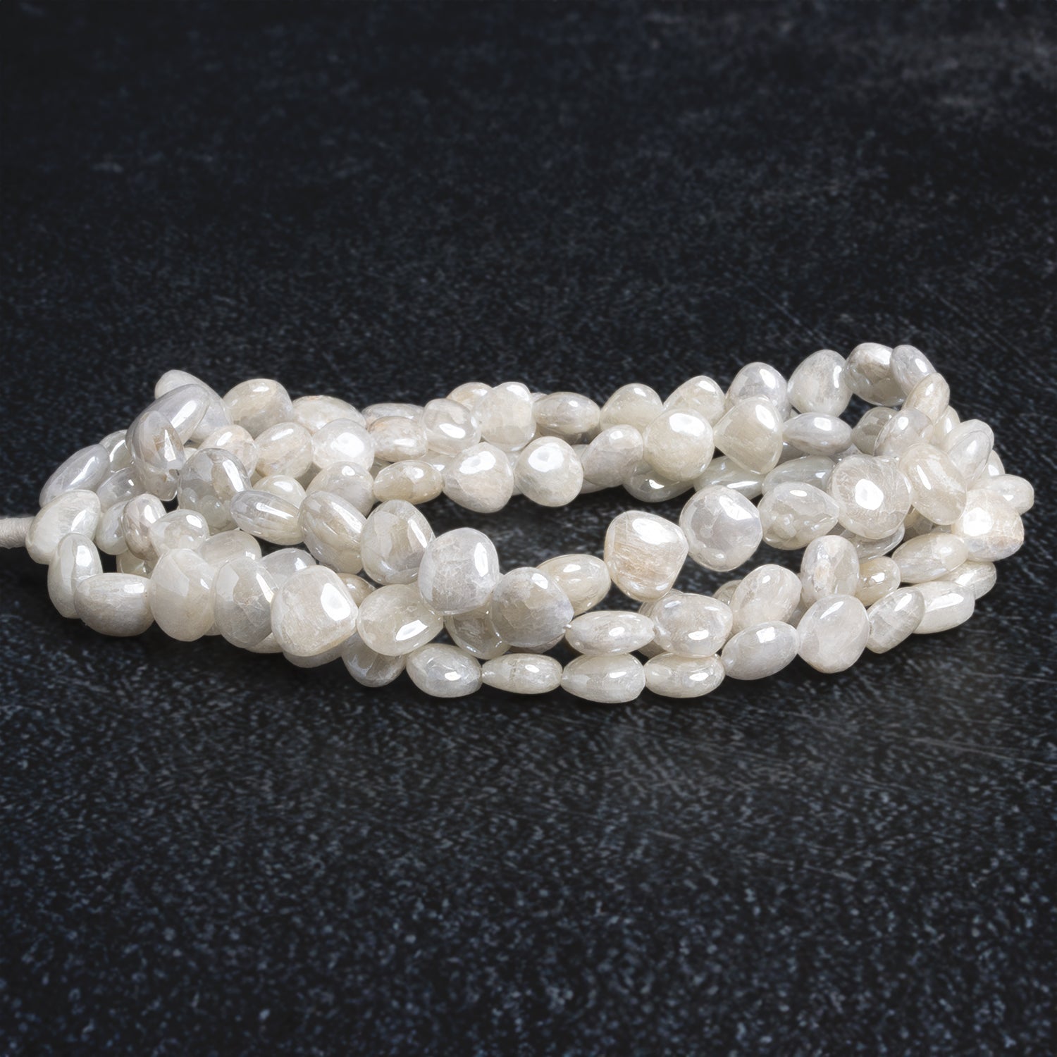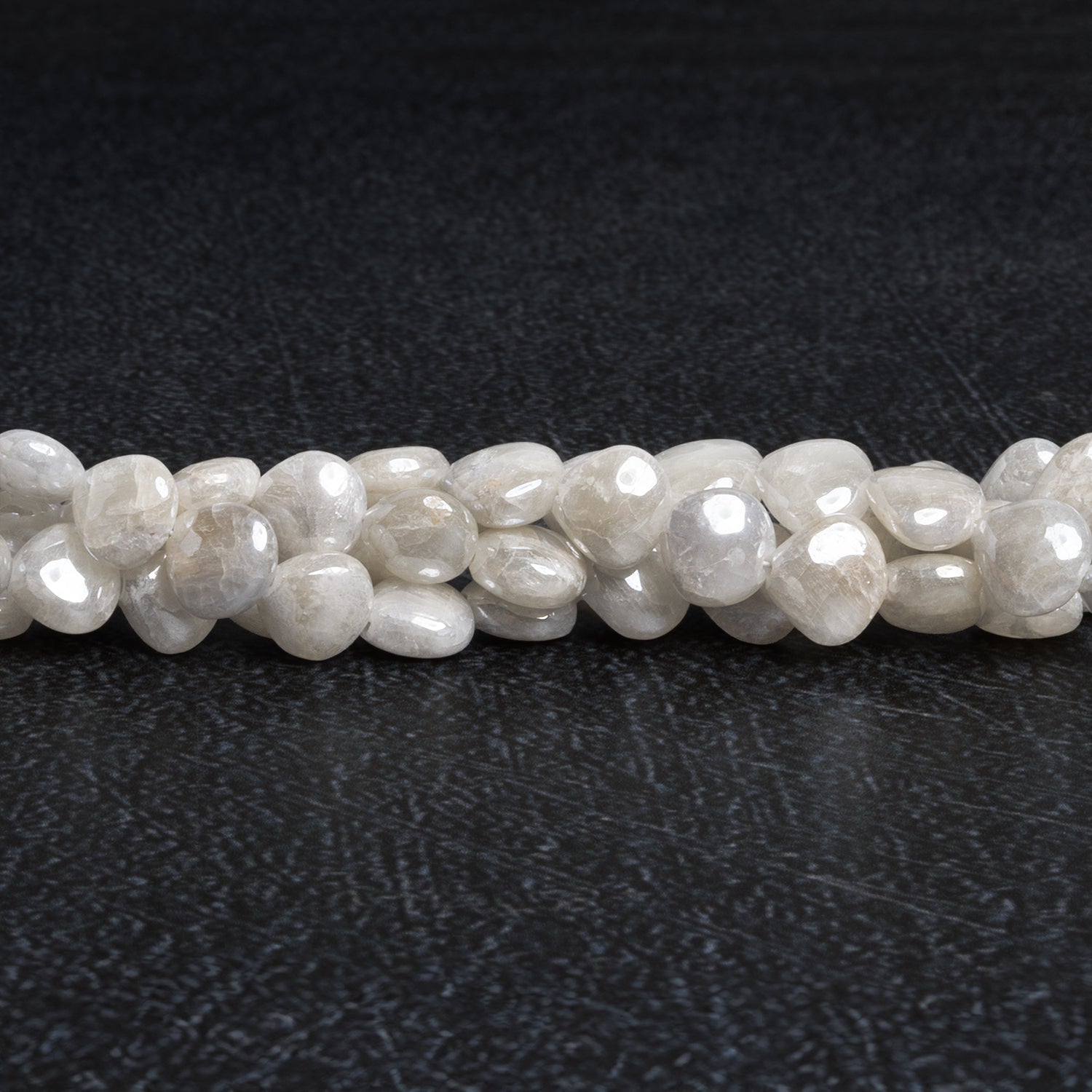 Beads range from about 6mm to 8mm in diameter. These gorgeous pieces feature a sleek, smooth polished heart shape. Expect an icey white, sometimes creamy tone enhanced by our signature mystic coating, which heightens reflectiveness in addition to imparting subtle, colorful overtones. Fans of sizable Sapphires with a novel look should jump on these specially curated strands, perfect for everything from a statement necklace to dainty earrings.