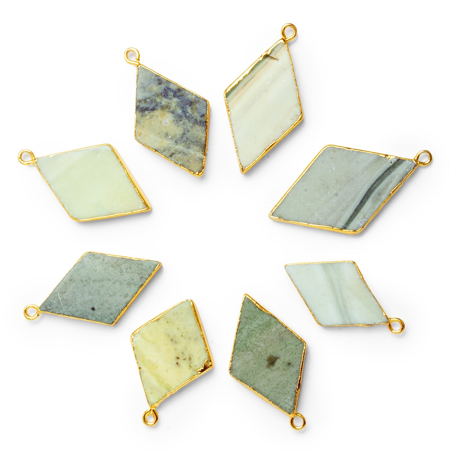 These Gold Leafed Serpentine Diamond Pendants feature natural serpentine gemstones cut into sleek diamond shapes and finished with gold leaf edging. Each pendant highlights the stone’s soothing palette of soft greens, yellows, and earthy variations, creating a balanced and organic aesthetic. The gold leaf detailing adds a refined shimmer, making these pendants versatile for both modern and bohemian-inspired jewelry designs.
