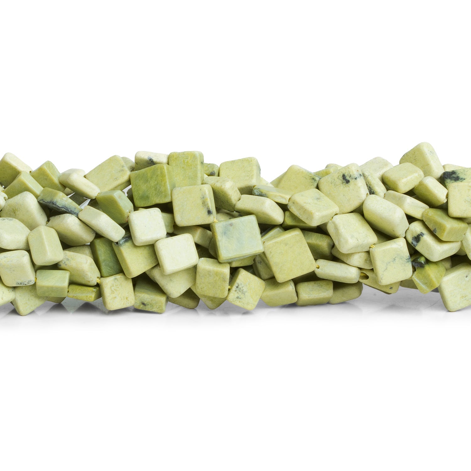 Experience the unique pastel-greens of our Serpentine Corner-drilled squares. These thin square beads are corner-drilled adding an opportunity for enhanced flair in design applications. Expect lighter and darker tones to be present across the strand with a spotted black pattern evident in some pieces. Fans of opaque Serpentine should jump on these brilliant offerings!