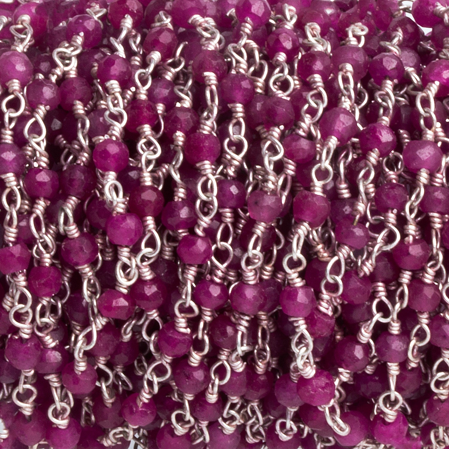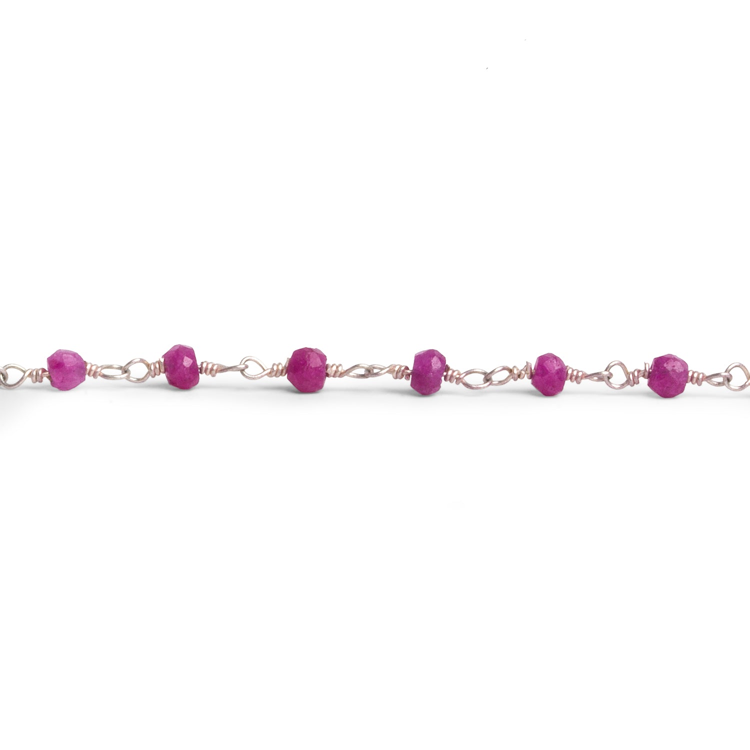 Our Pink Jade Faceted Rondelle Silver Chain features luminous, hand-faceted beads averaging 3.5mm in diameter, each displaying a vivid, jewel-like fuchsia hue. The facets catch and reflect light beautifully, giving the beads a lively sparkle against the cool tone of the silver. Each bead is meticulously linked by hand with silver wire, creating a fluid chain that blends refined elegance with artisanal craftsmanship.