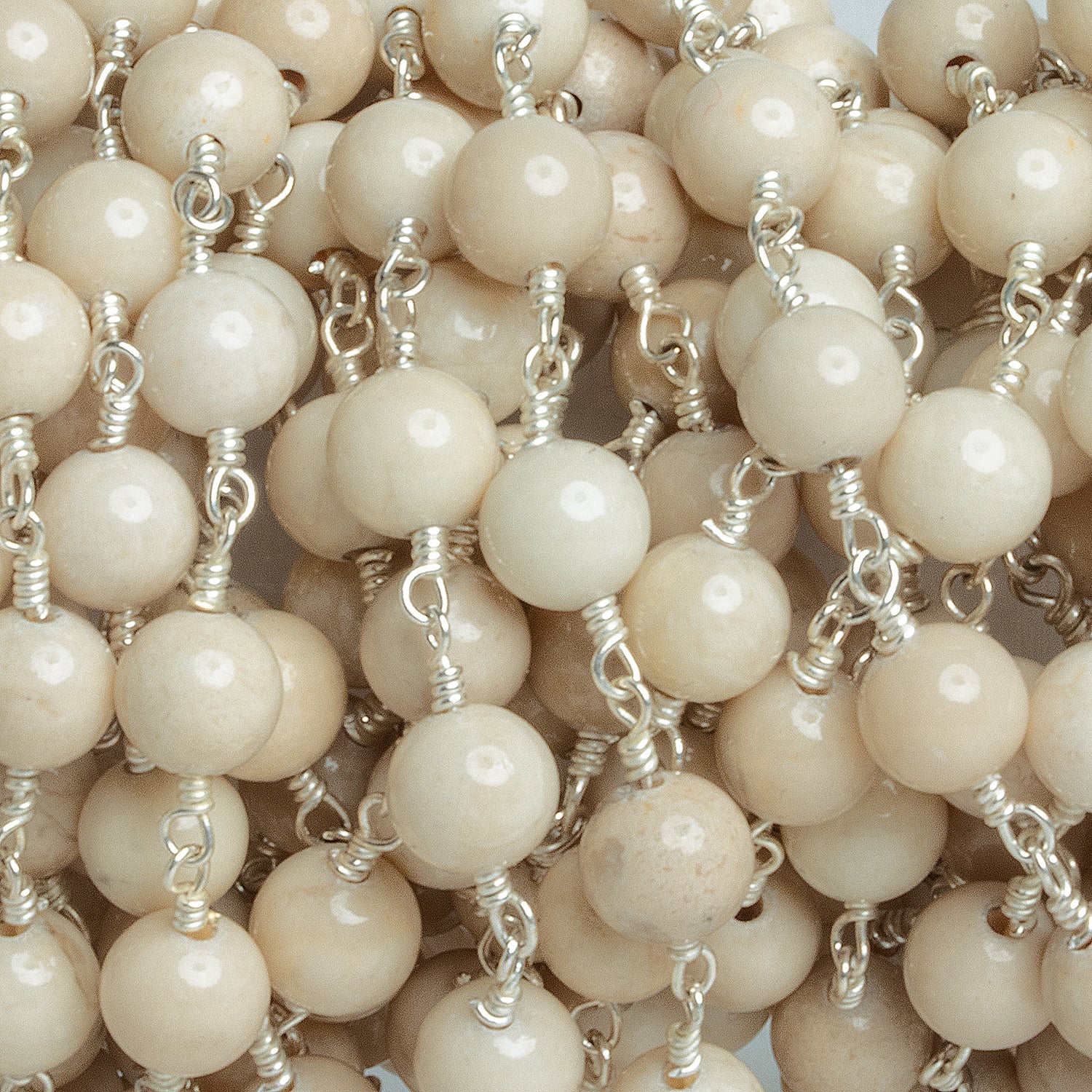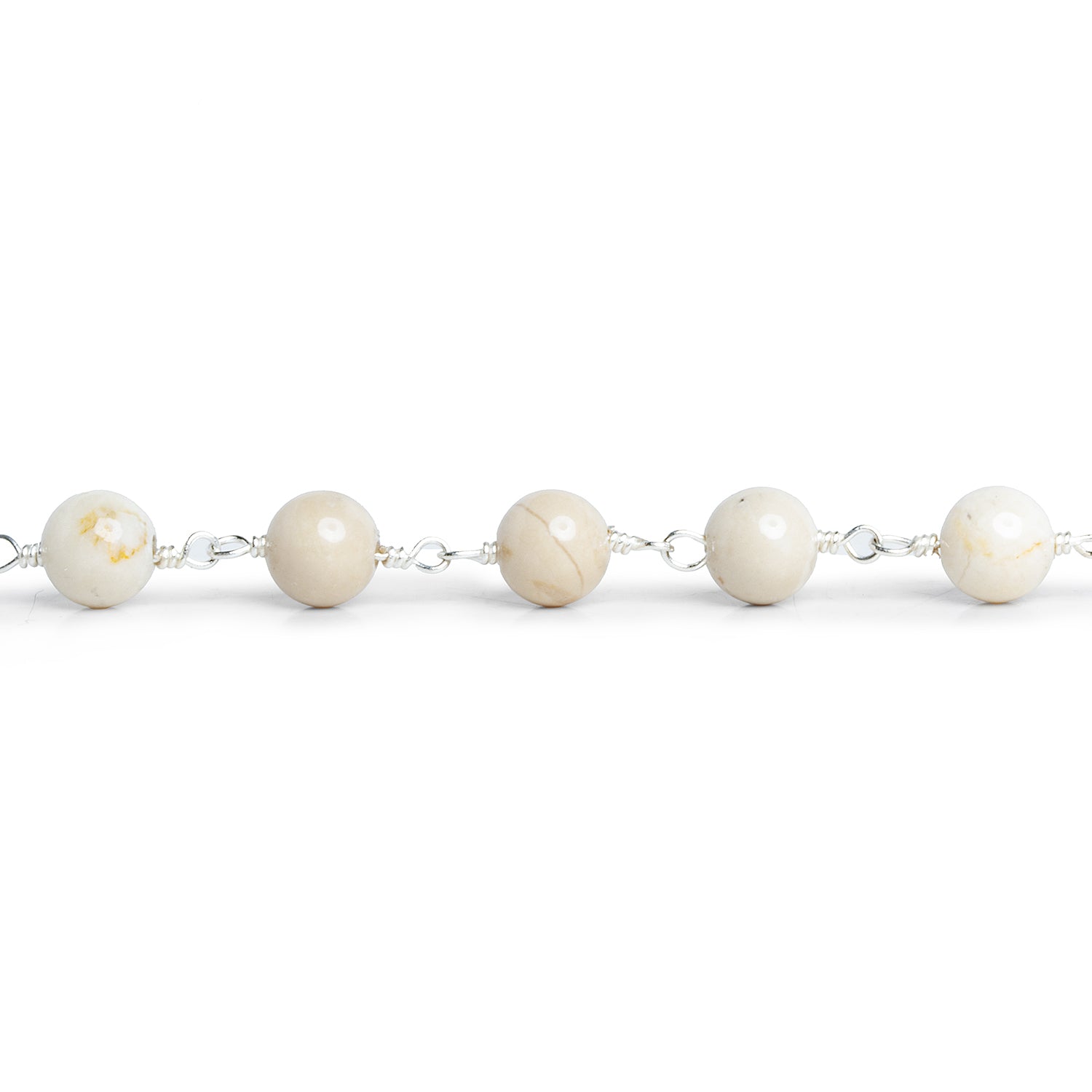 Beads measure about 6mm in diameter with about 25 beads per foot of chain. These smooth polished, light-tan rounds offer a bright & earthy look paired with our signature hand wrapped silver plated chain. Fans seeking eye-catching chain and hand-crafted quality should jump on this colorful design, perfect for statement necklaces, earrings and more!