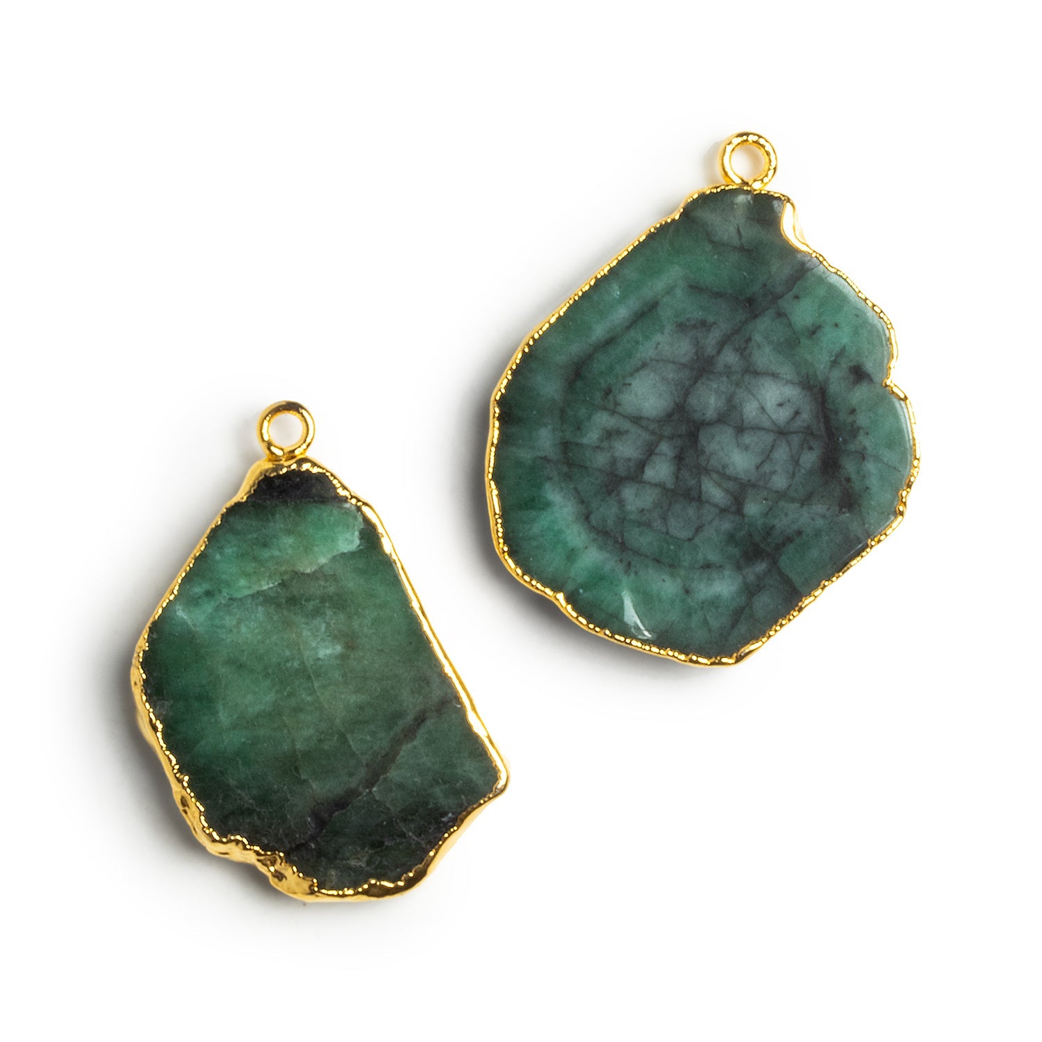 Beads measure about 32x21mm. These incredible Emerald pieces feature rich green opaque emerald in a natural slice shape that looks amazing enveloped in our gold leaf. These colorful, organic-looking designs are sure to catch the eye as the focal bead of necklaces, as earrings, and more!