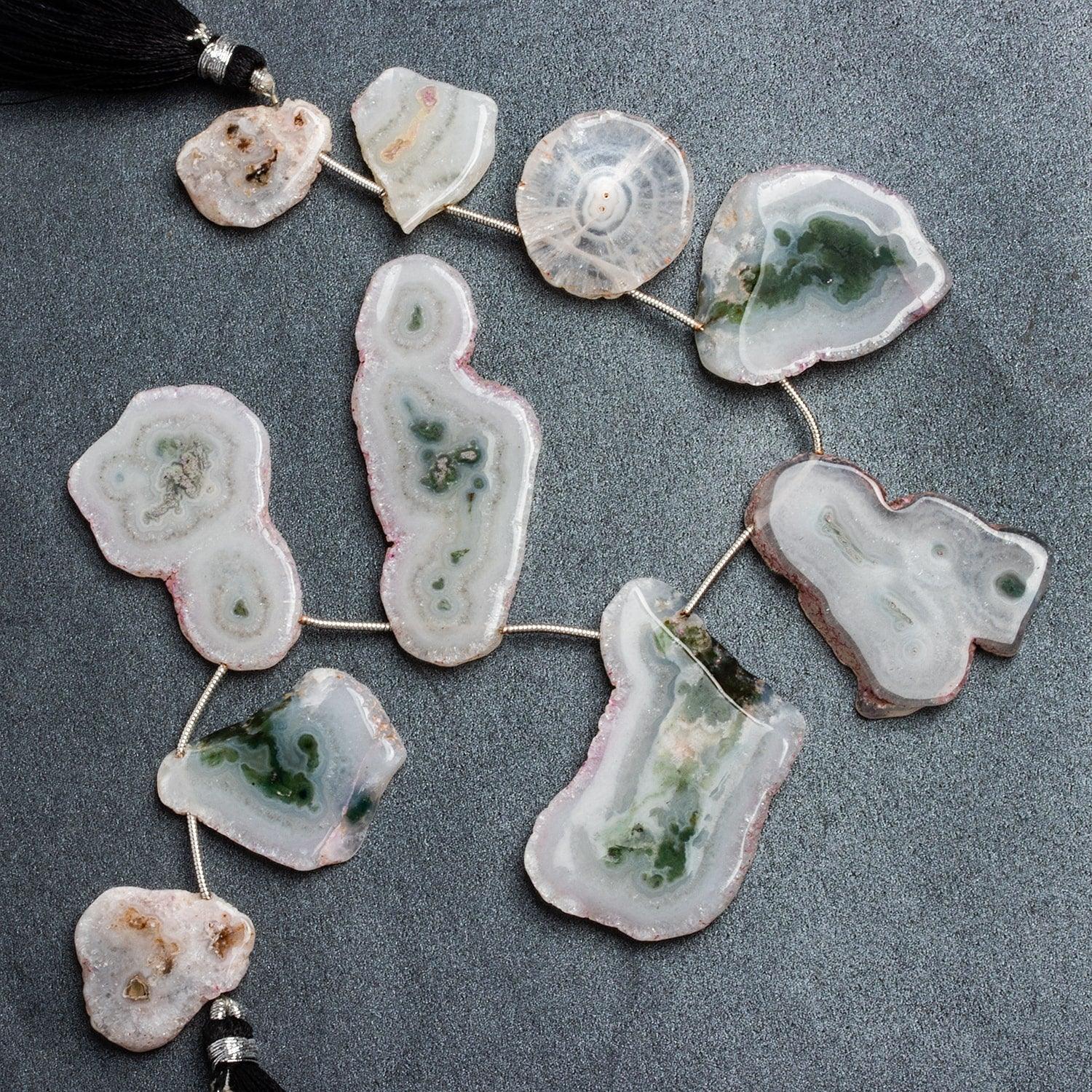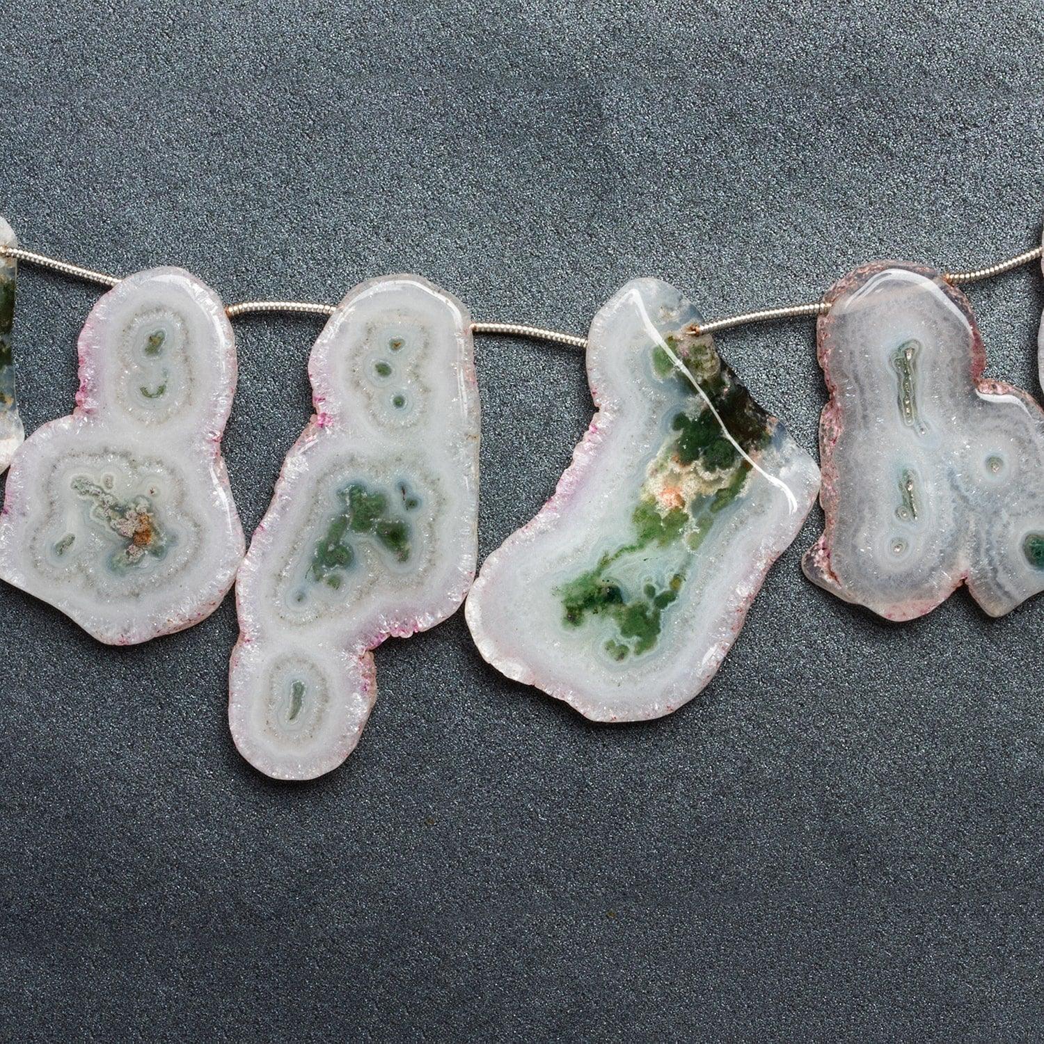 Beads range from about 19x14mm to 44x32mm. These irregularly shaped natural slice beads have thin, cloudy to opaque bodies with mossy inclusions and the crystalline texture that makes Solar Quartz sought after. Expect a pink coloration around the edges and in natural grooves of some beads.