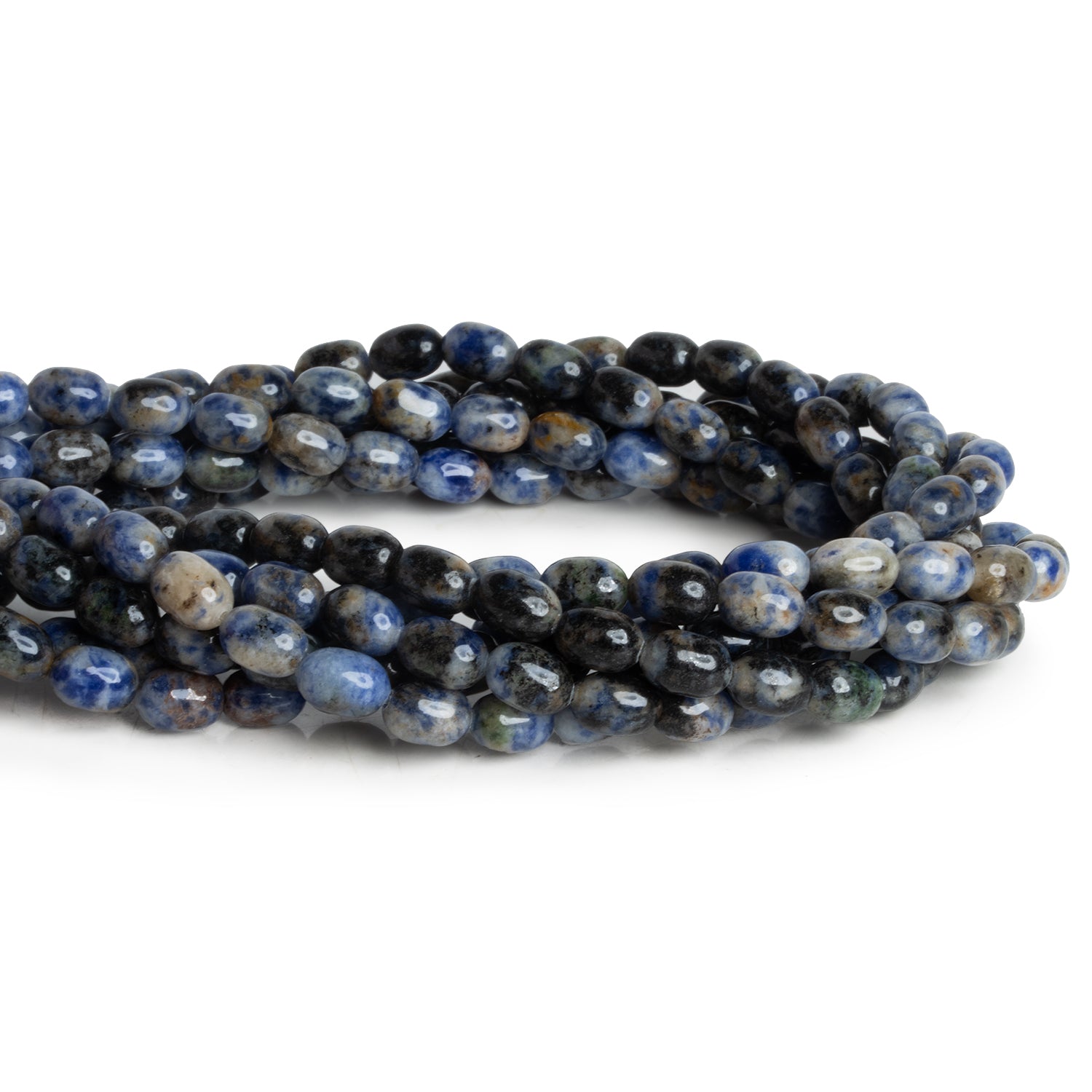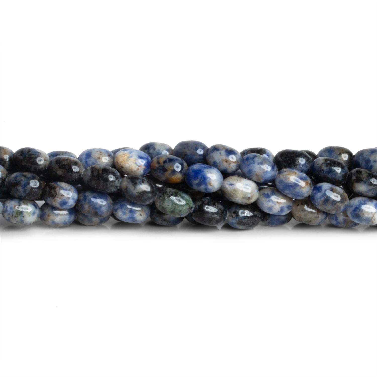 Beads measure about 9x8mm. These beautiful beads have a thick, rice shape similar to that of a slightly elongated pill. This unique shape sees an incredible mix of Sodalite hues from dark blues to webs of black and reddish tones. These highly consistently sized pieces are perfect for a wide range of Jewelry Designs from necklaces to earrings and more.