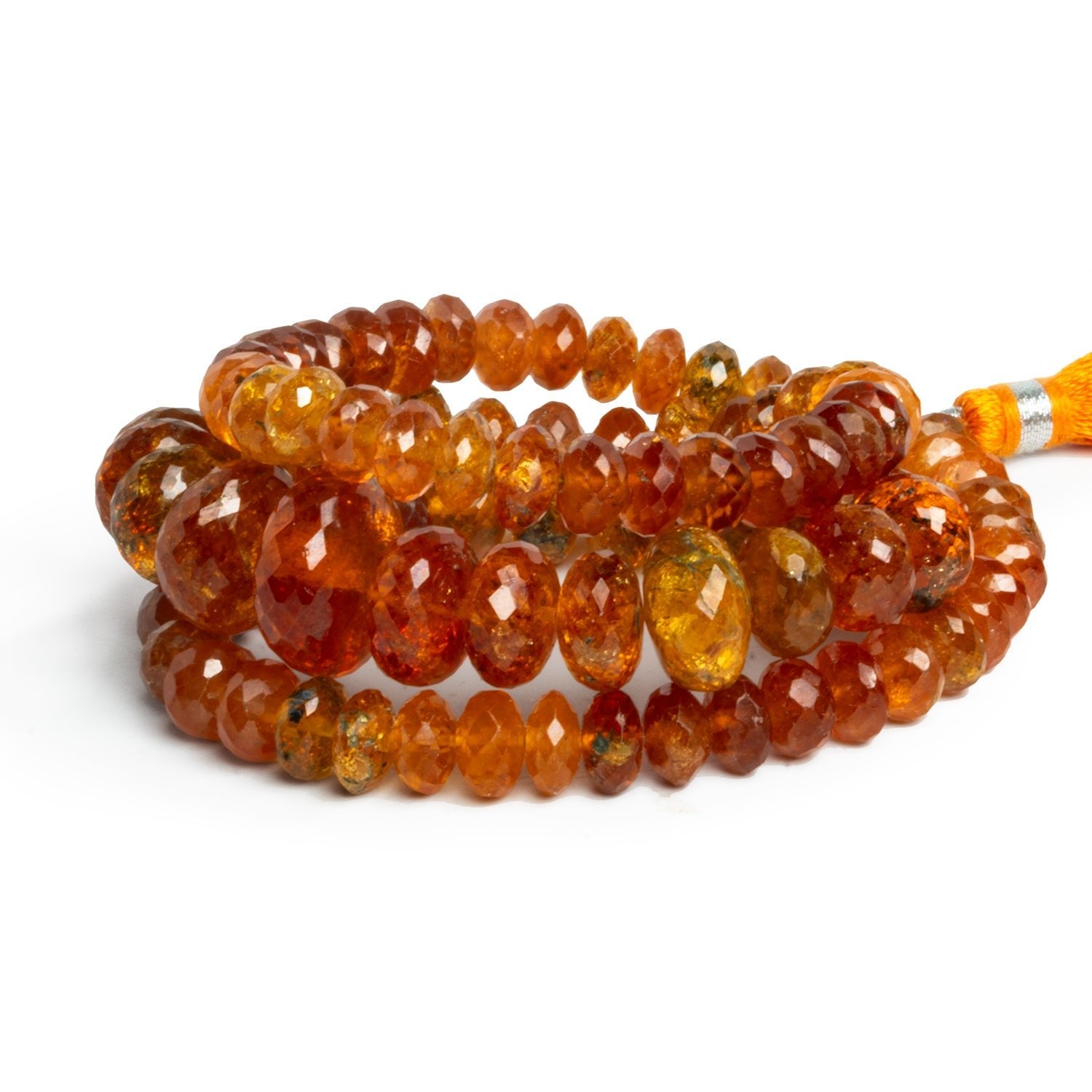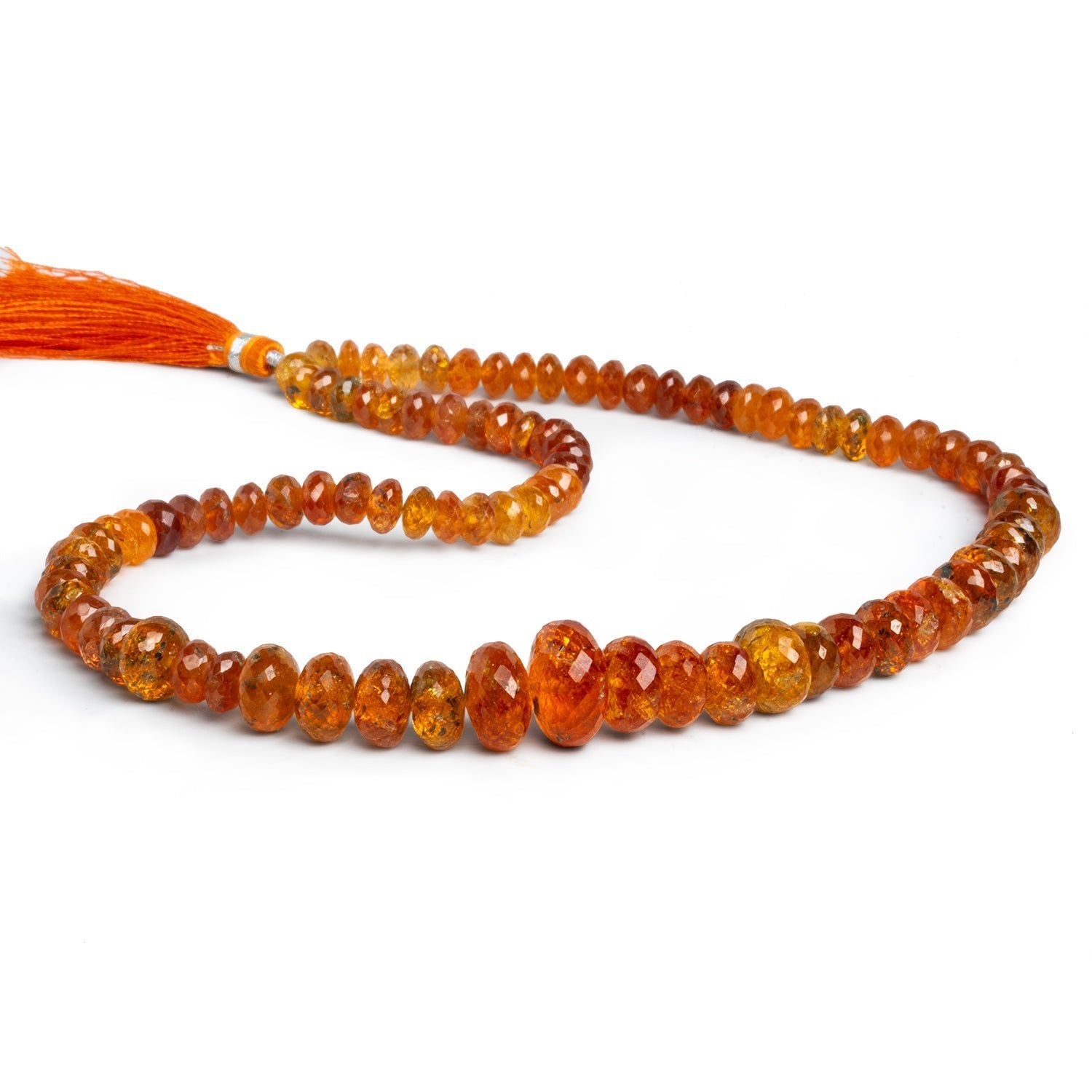 These faceted Mandarin Garnet rondelle beads display a vivid range of warm orange hues, from glowing amber and honey to deeper coppery tones, with excellent translucency and internal fire. The careful faceting brings out lively flashes of light while still showcasing natural inclusions and color variation within the stone. Graduating from approximately 6–13mm, the rondelle shape creates an elegant rhythm along the strand, with larger center beads adding visual weight and balance.