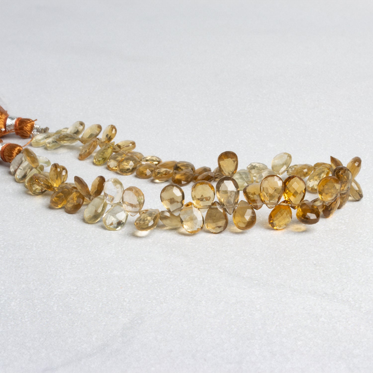 Beads measure about 8x6mm with a mm or so of variation possible. Fans of the subtle tones of Whiskey Quartz should jump on this specially curated strand of virtually flawless faceted pears, which sparkle with a pretty gleam that enhances their whiskey hues.