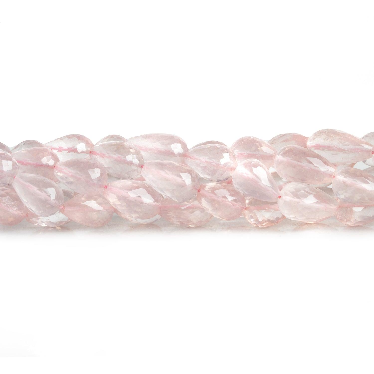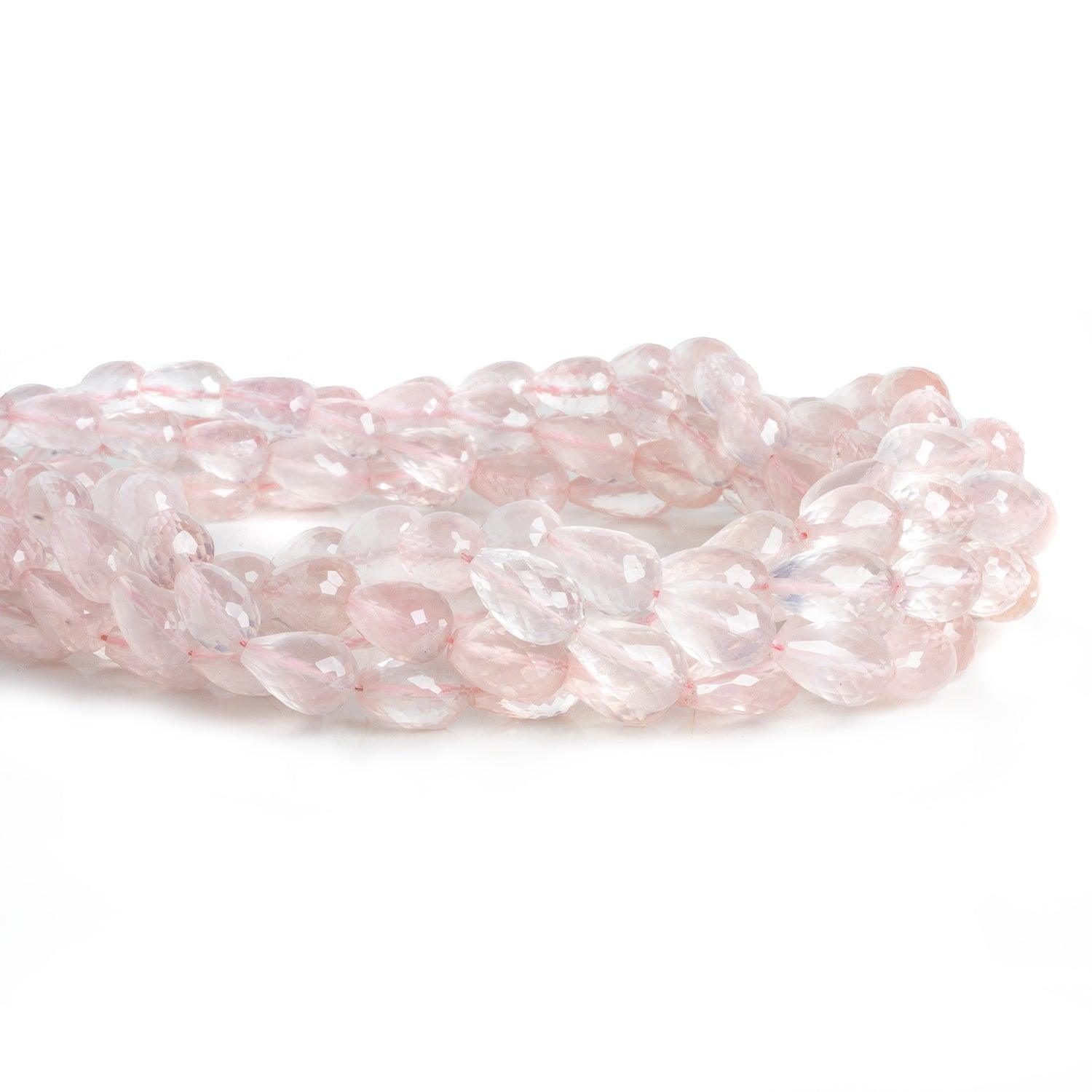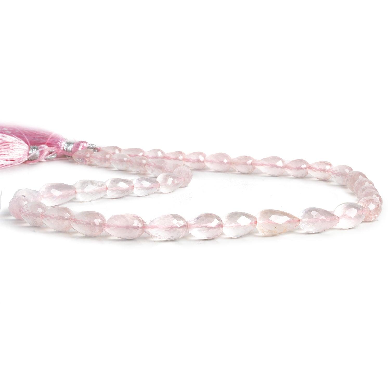 This graduated strand features 40 faceted teardrop beads measuring approximately 9x6mm to 13x8mm. Each bead displays a soft milky pink hue with nearly flawless translucent clarity. Slight size variations are natural throughout the strand.