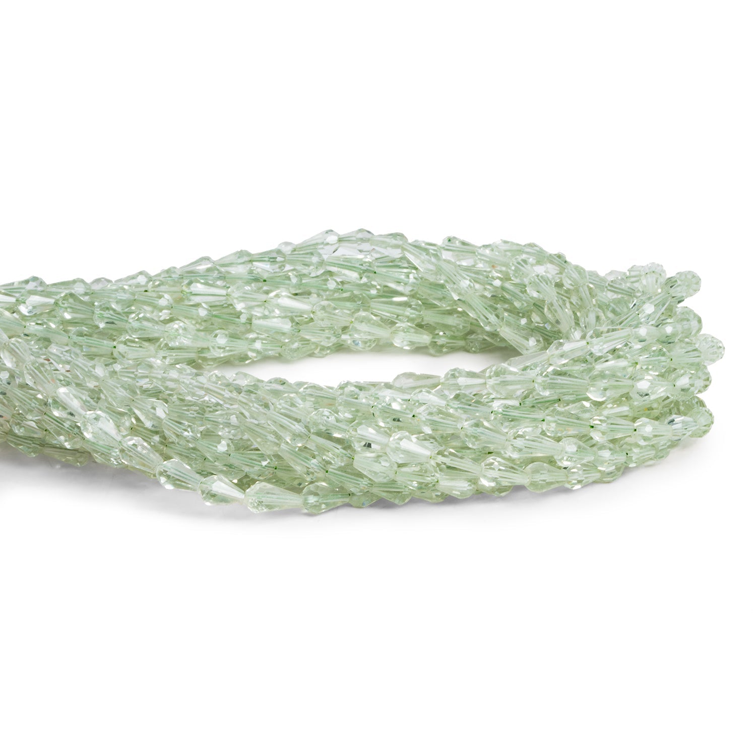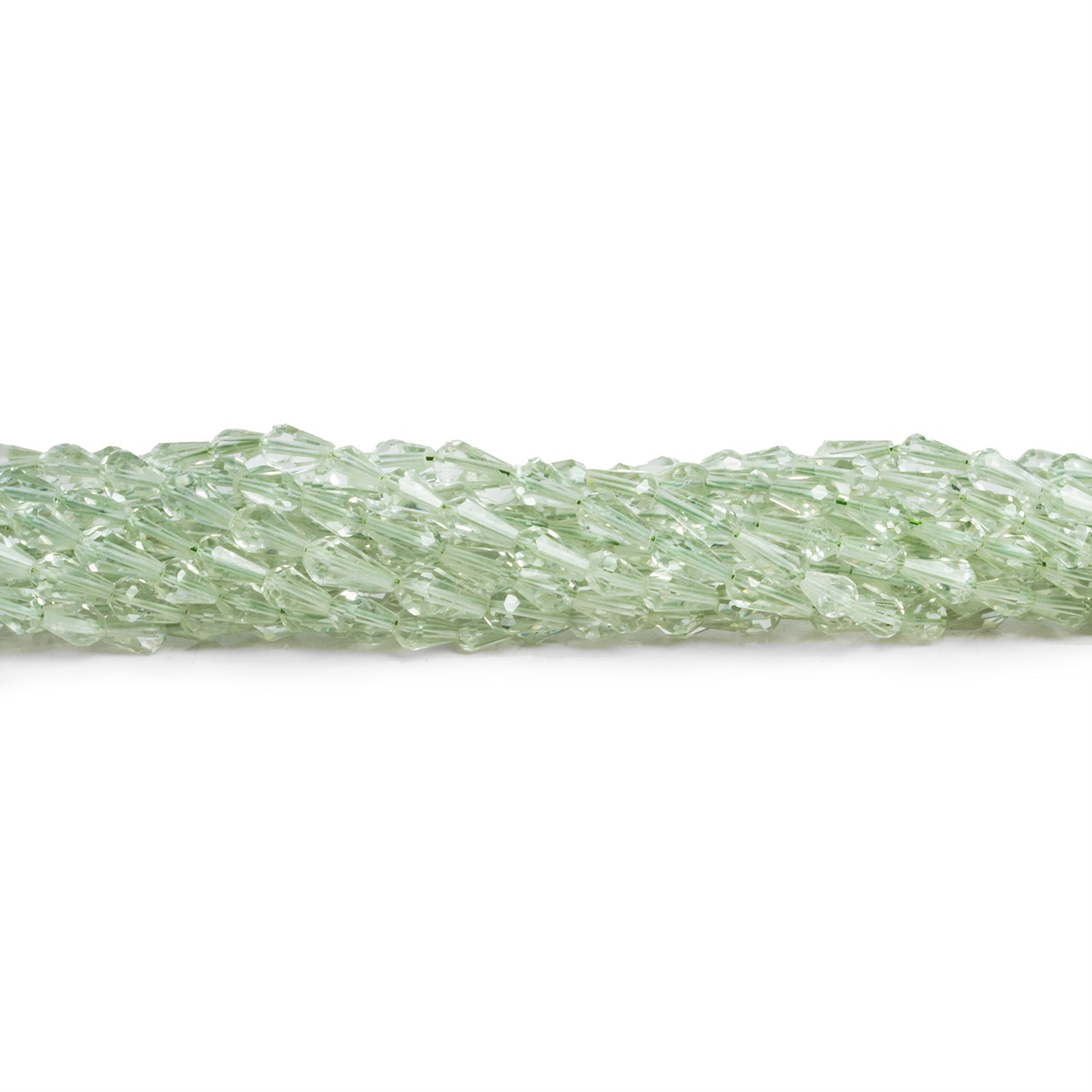 Beads range from about 5x3mm to 7x4mm. These fantastic, straight drilled strands feature sleek faceted, translucent bead bodies of high translucency. Expect a consistent, light-green Prasiolite coloration familiar to fans of this magnificent gemstone also know as Green Amethyst. Jewelry makers should jump on these elegant pieces worthy of their most luxurious designs, for use in necklaces, bracelets, earrings and virtually any other creative project.