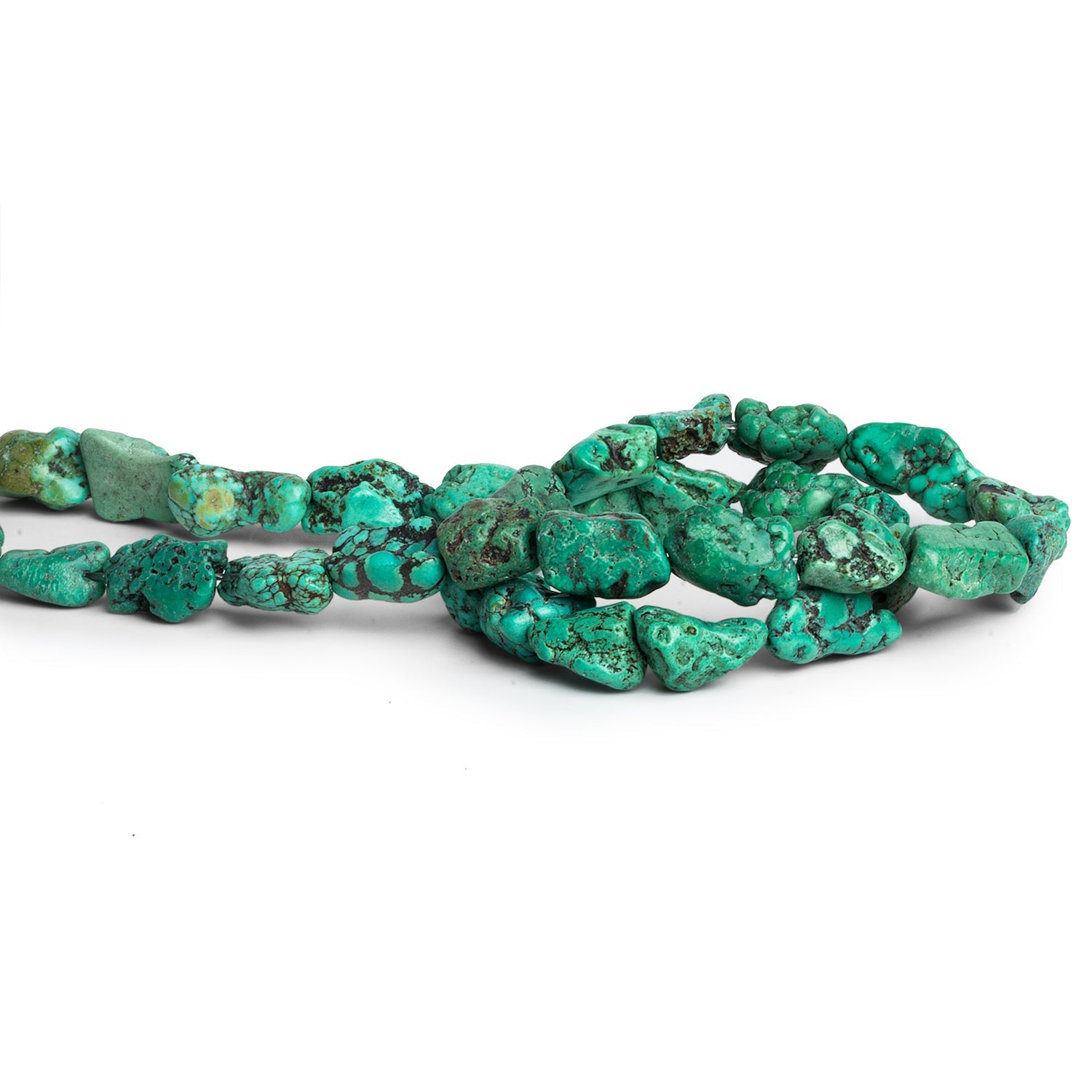 Add a bold, earthy statement to your designs with these Natural Chinese Turquoise Nugget Beads. Ranging from 9x7mm to 19x14mm, each bead showcases a rich spectrum of turquoise hues—from deep forest and teal tones to brighter aqua highlights—interwoven with distinctive dark matrix patterns that emphasize their natural origin. Their freeform nugget shapes give every strand a unique, organic beauty, making them an ideal choice for one-of-a-kind creations.