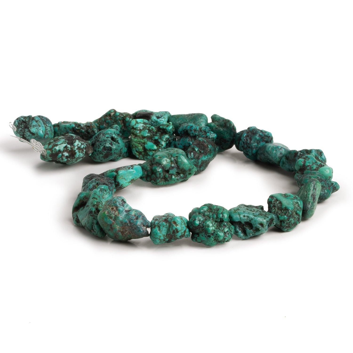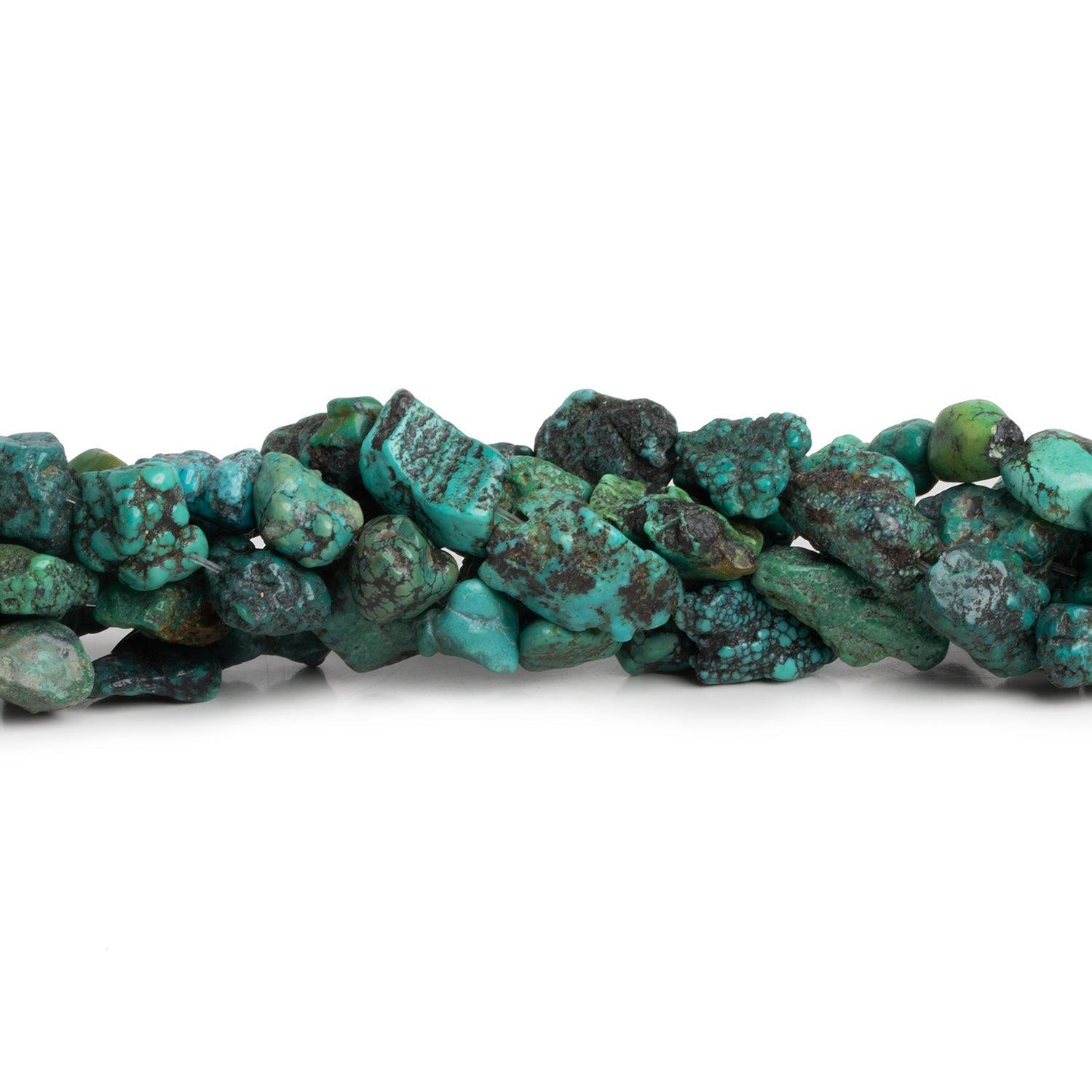 Beads measure about 16x13mm to 21x16mm. These Chinese Turquoise pieces feature a vibrant blue-green color palette with darker accents. Expect exciting organic textures and patterns across a naturalistic, tumbled nugget shape.