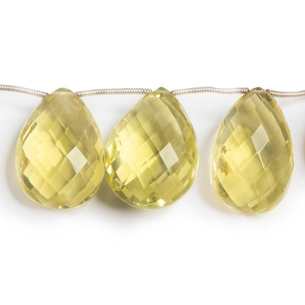 Lemon Quartz Pear Briolettes measure approximately 17x12mm up to 23x18mm in size, have a vitreous luster, excellent cut and polish, superior faceting, symmetrical pear shapes, transparent body of a very slight greenish medium yellow hue with no eye visible internal characteristics other than very slight color zoning common to the quartz species.