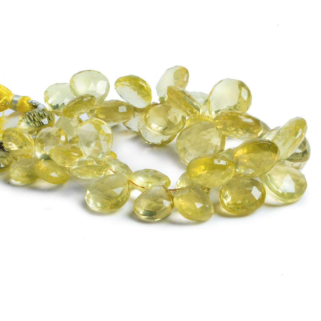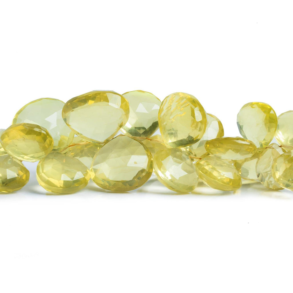 Beads range from about 11mm to 19mm in diameter on a graduated briolette strand. These are high-grade, masterfully faceted beads with virtually no flaws or internal characteristics readily visible. Beads are highly consistent in shape and offer a perfect example of beautiful, light-colored Lemon Quartz!